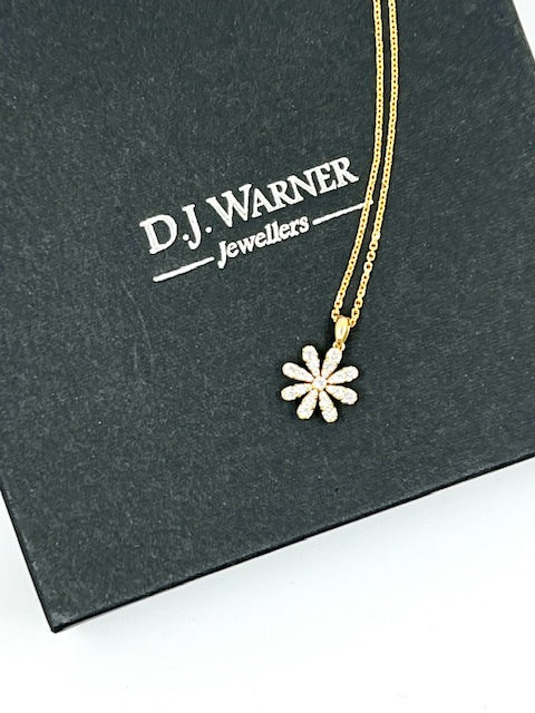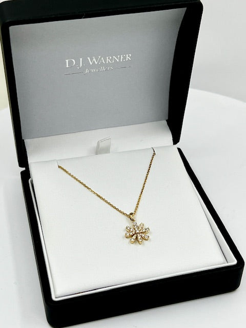 An 18ct yellow gold daisy pendant set with round brilliant cut diamonds. The pendant hangs on an 18-inch/45cm 18ct gold trace chain.