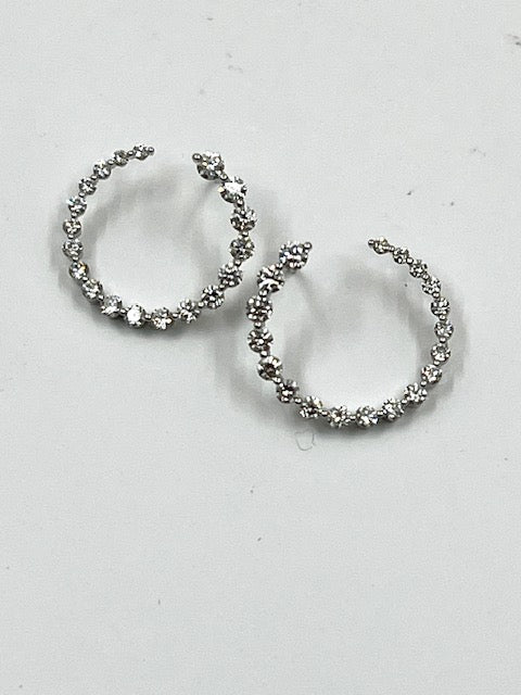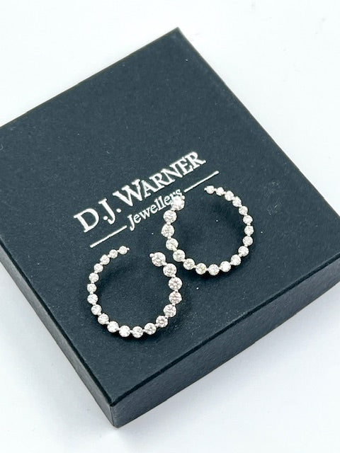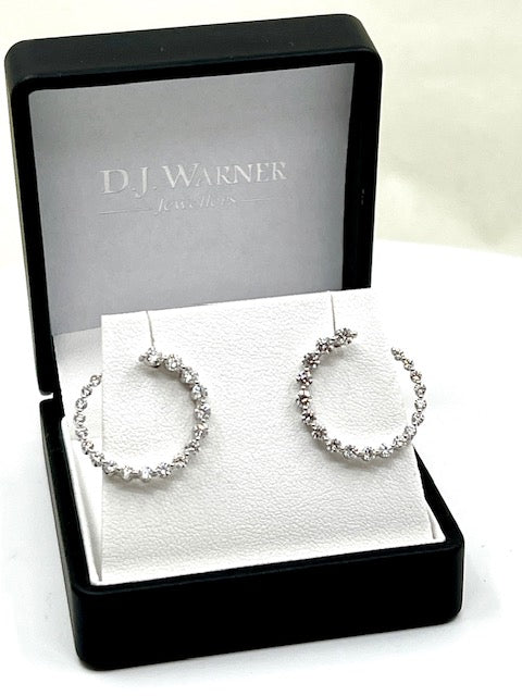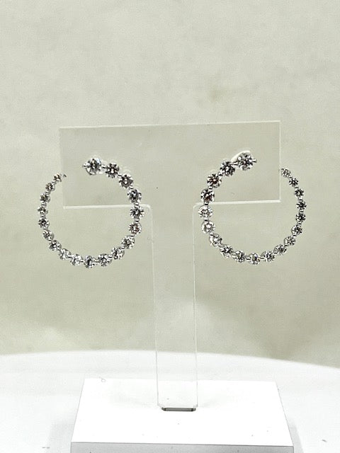 18ct white gold earrings featuring brilliant cut diamonds in a circular curl design. There are 19 graduating diamonds that elegantly curl from the front to the back of the ear.