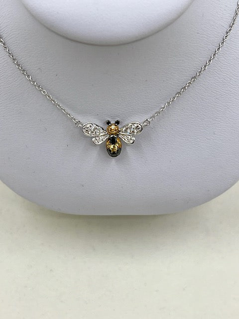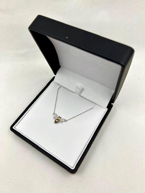 18ct white gold sapphire and diamond set bee pendant and chain. The body of the bee is set with yellow and black diamonds with white diamonds set in the wings all set into white gold. The pendant is fixed to an 18ct white gold 16 inch fine trace link chain.
