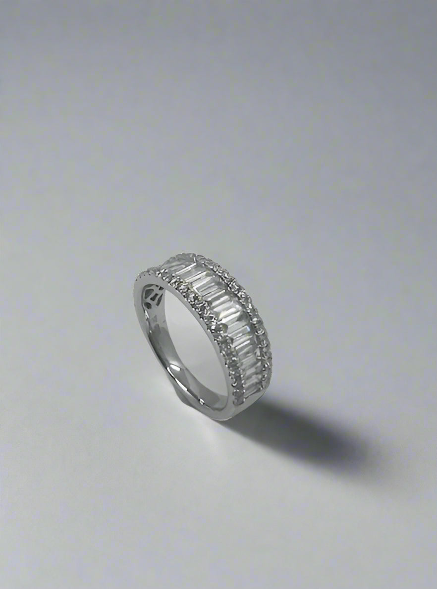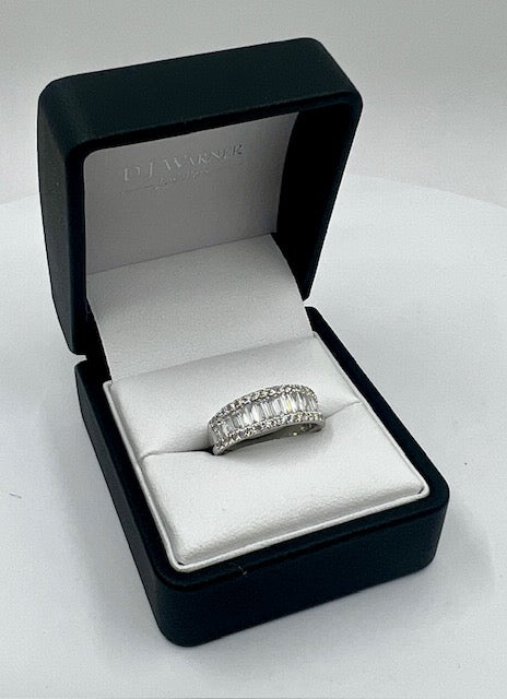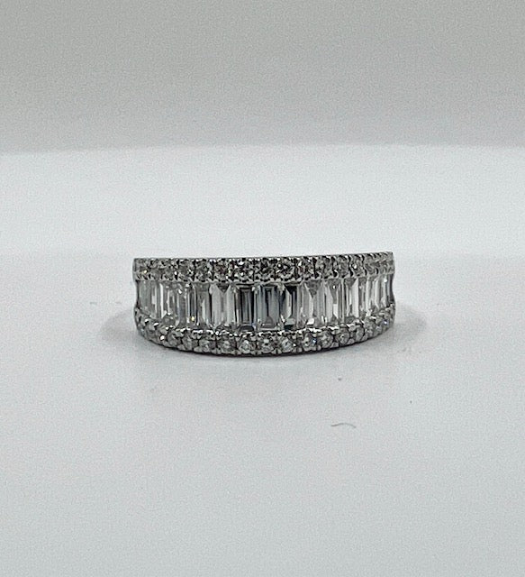 18ct white gold baguette and brilliant cut diamond dress ring. Central row of 18 graduating baguette cut diamonds with a single row of brilliant cut diamonds above and below.
