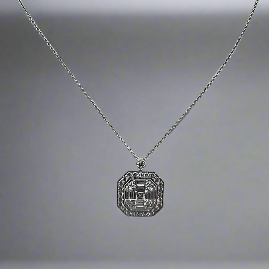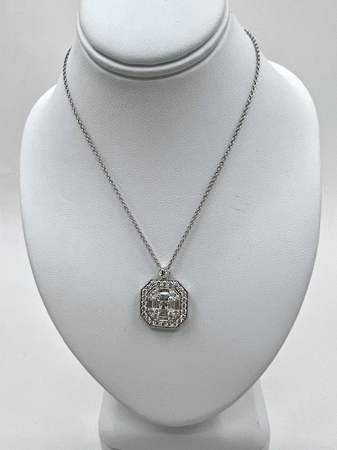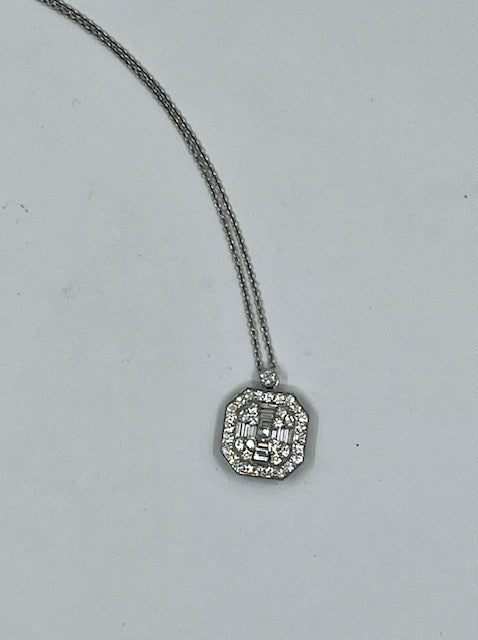 18ct white gold octagonal diamond pendant. The centre section is set with a cross formation made up of emerald, baguette and brilliant cut diamonds. Surrounded by a single row halo of brilliant cut diamonds and a single diamond above that the chain runs through. Fitted to a 16-inch trace link chain.