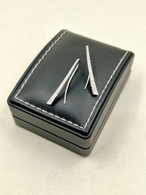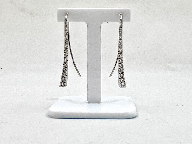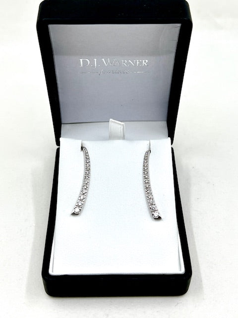18ct white gold diamond drop earrings. A single row of 15 graduating round brilliant cut diamonds in square box settings as a curved bar with a long hook wire fitting that curves behind the ear.