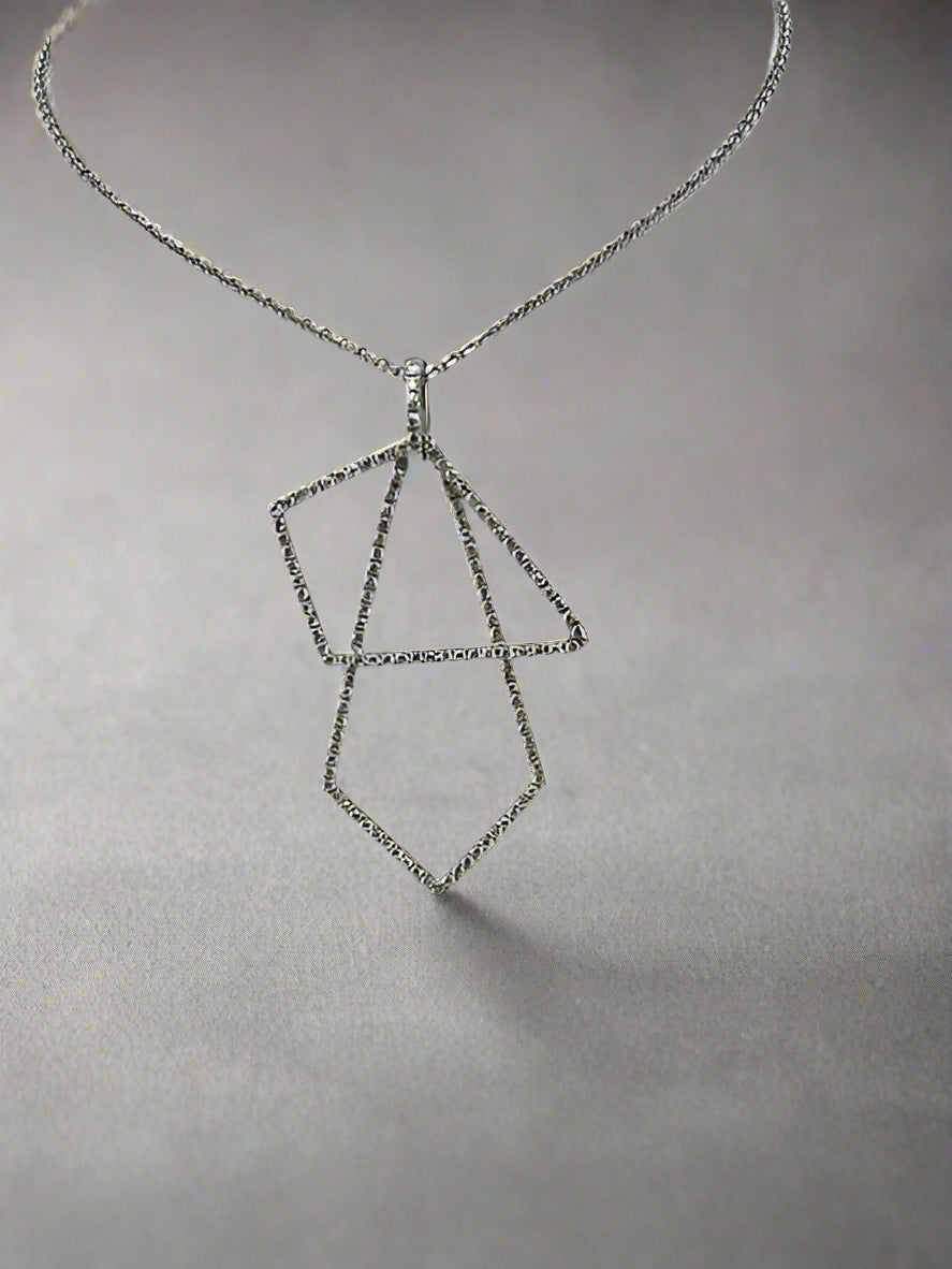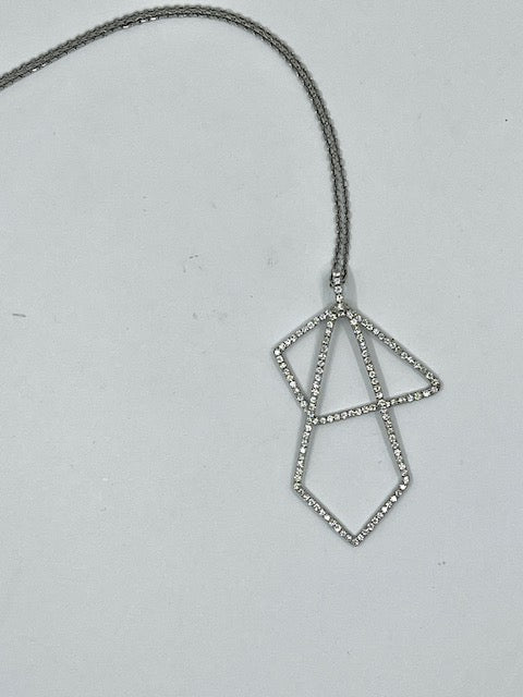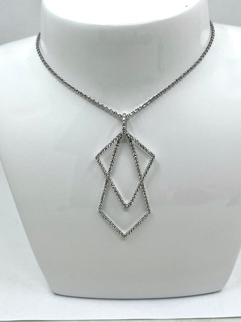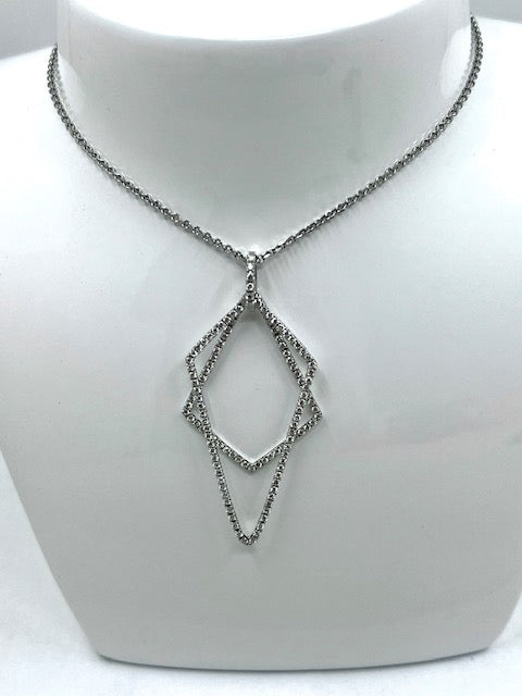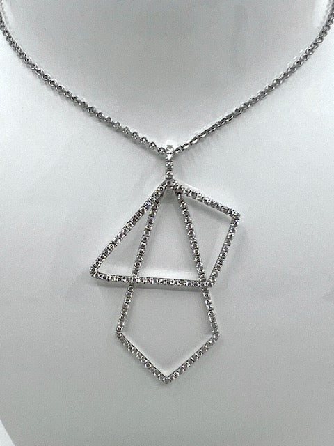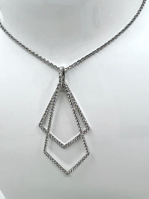 18ct white gold double kite shaped diamond set abstract pendant. Each kite shape, formed of an open single row of grain set brilliant cut diamonds, can be spun around to create different looks and shapes. The pendant hangs on a sixteen inch trace chain.