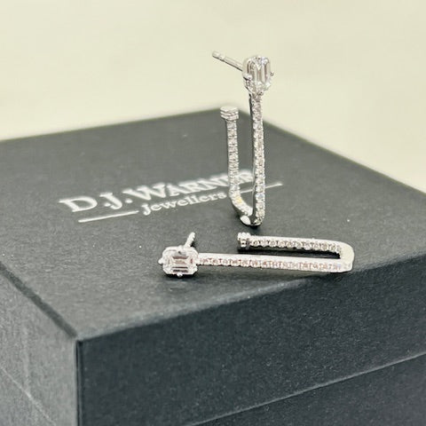 18ct white gold diamond-set hoop earrings. At the top, a single emerald-cut diamond is in a four-claw setting, with a grain-set diamonds in a rectangular shaped hoop section below.