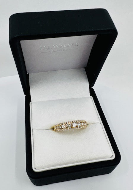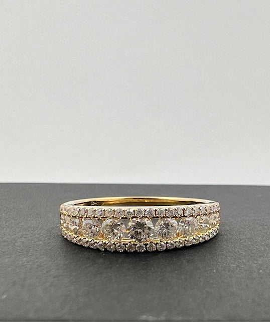 18ct yellow gold diamond eternity ring. A central graduating row of 11 brilliant cut diamonds with a single row above and below of 25 grain set small briliant cut diamonds.