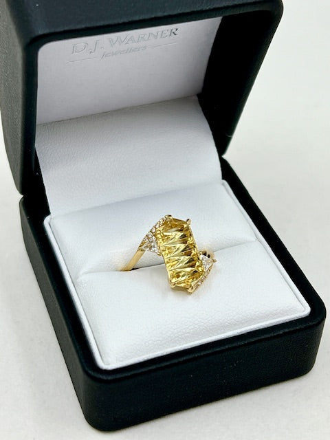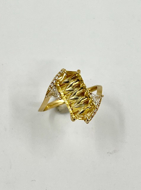 18ct yellow gold beryl and diamond ring. A golden beryl with a zig zag design cut by gem artist John Dyer in a handmade mount with a single triangular diamond either side and further diamonds on each shoulder. Designed and made in house.