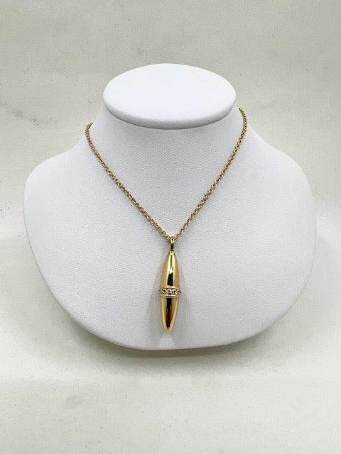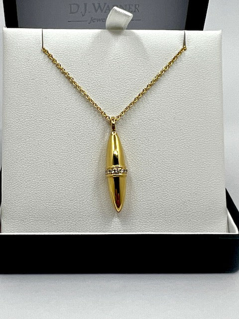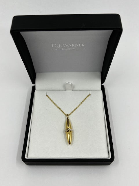 18ct yellow gold diamond set bullet pendant. A bullet shaped pendant with a single row of grain set diamonds around the middle. The pendant hangs on an 18ct yellow gold 18 inch trace chain.