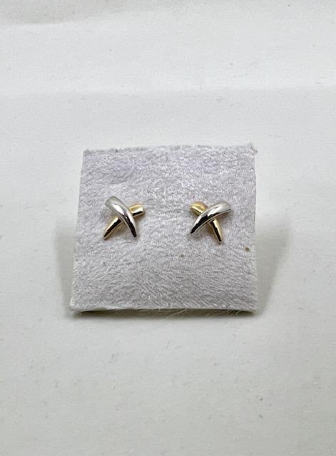 9ct yellow and white gold X kiss stud earring with a post and butterfly fitting.