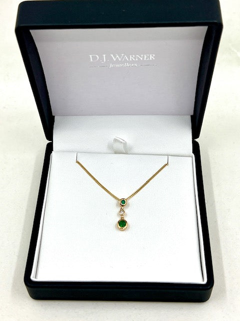 9ct yellow gold three stone emerald and diamond drop pendant and chain. A single round emerald with a similar size round brilliant cut diamond below and a 2nd larger round emerald hanging at the bottom. All stones in bezel settings and the pendant hangs on an 18 inch/40cm curb link chain.