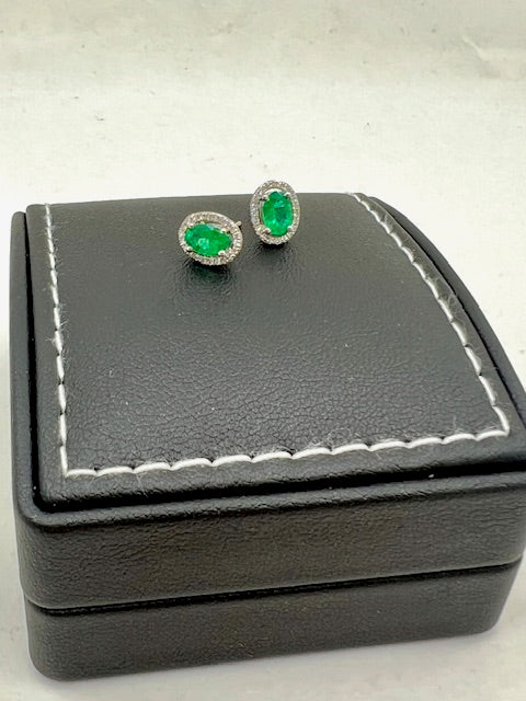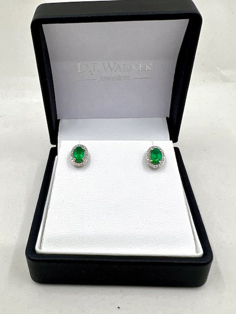 9ct white gold oval emerald and diamond halo style cluster stud earrings. A single oval mixed cut emerald surrounded by a halo of grain set diamonds with a post and butterfly fitting.