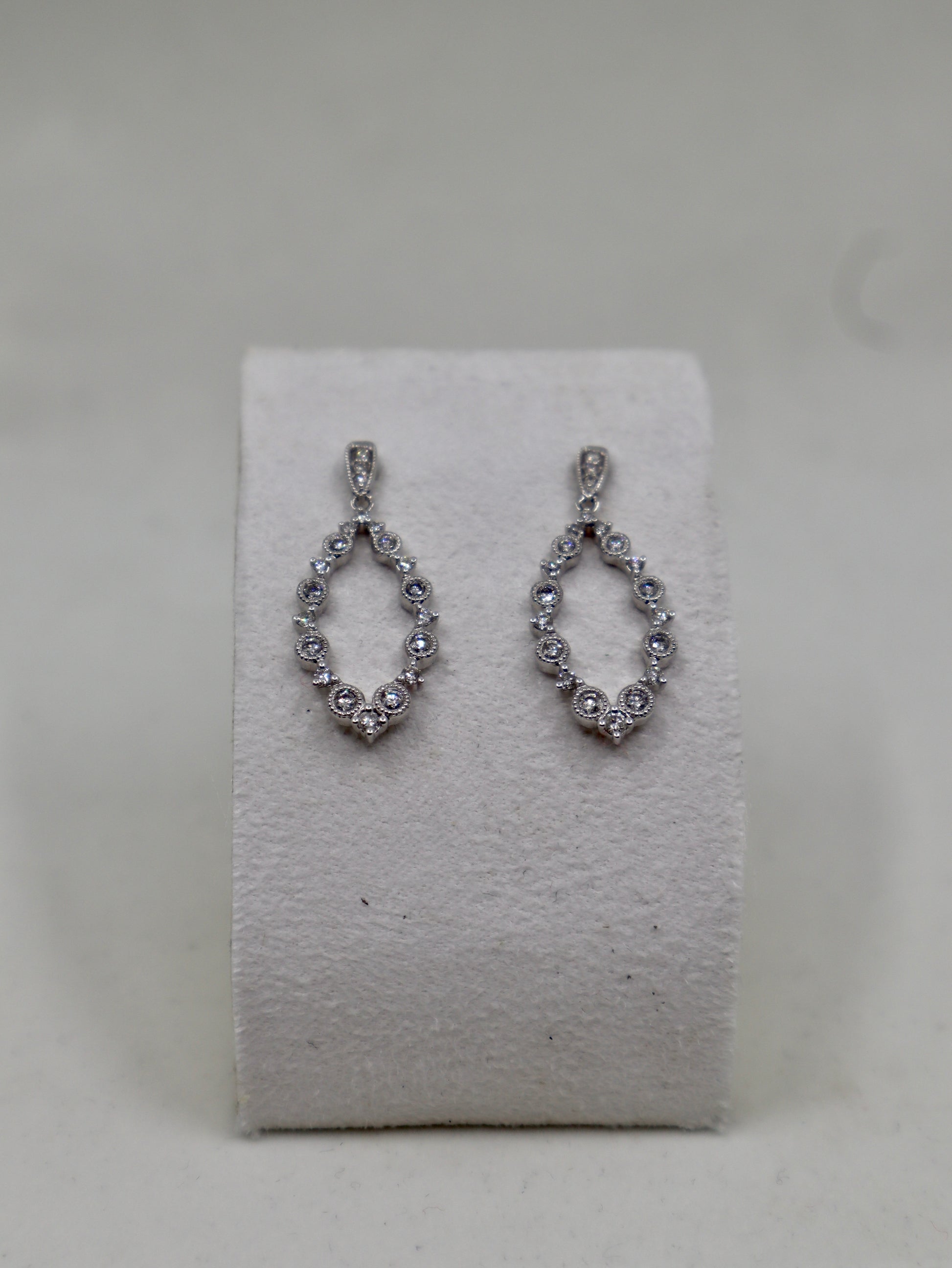 18ct white gold diamond set drop earrings. An open marquise shape set alternately with claw set and grain bezel set round brilliant cut diamonds with a diamond set bar above fitted with a post and butterfly. Diamond weight 0.50ct.