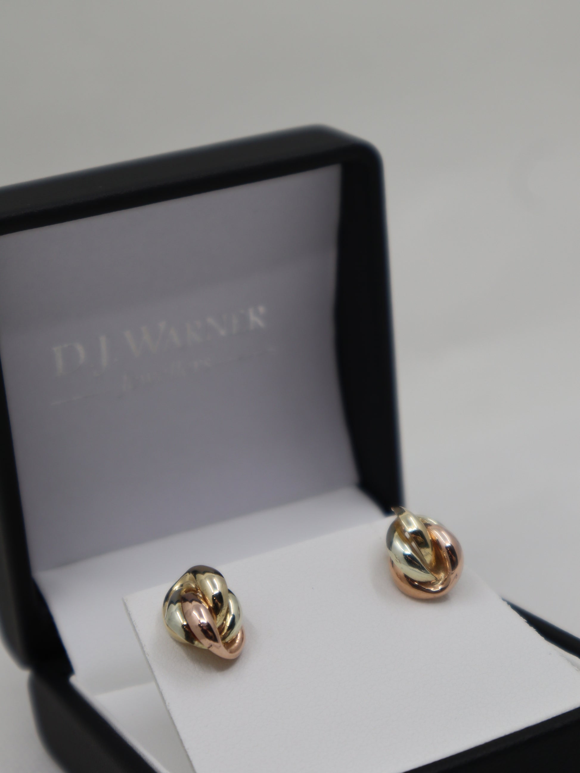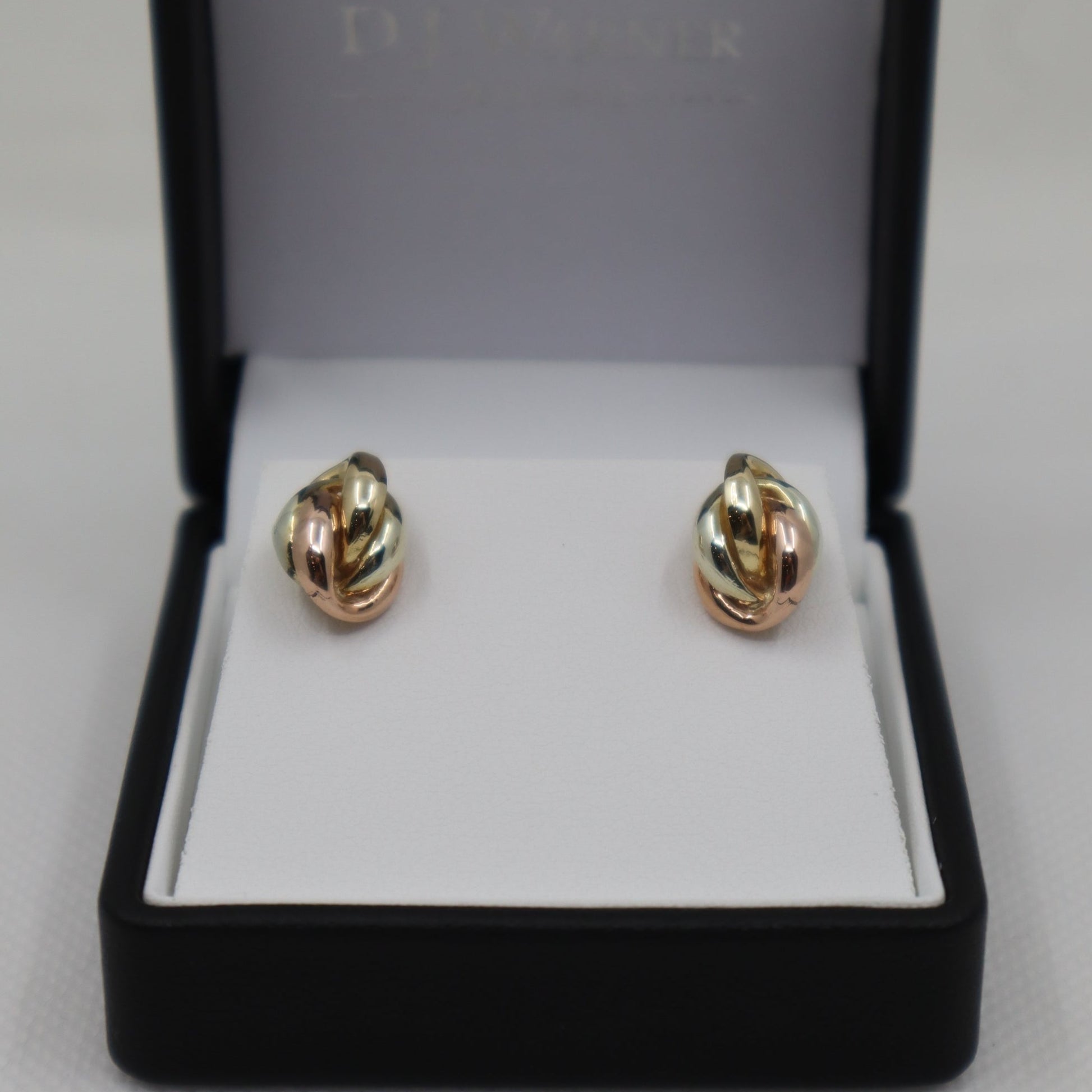 9ct gold triple oval linked stud earring. A single yellow, white and rose gold oval link