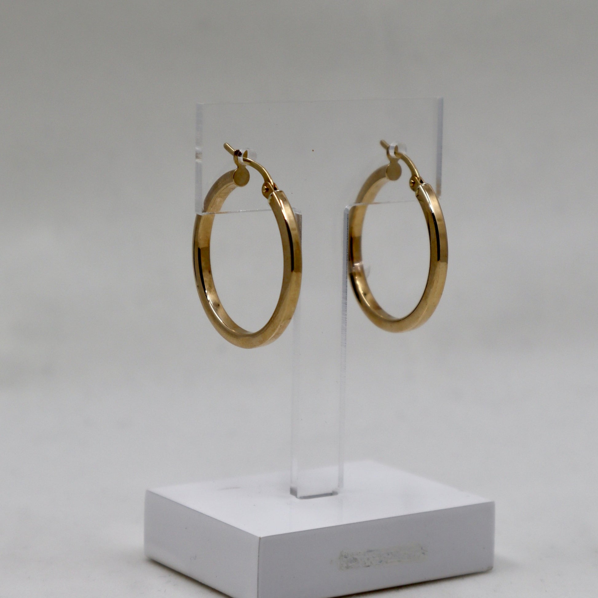 9ct yellow gold plain 24mm round hoop earrings. A square cross section tube 2mm wide.