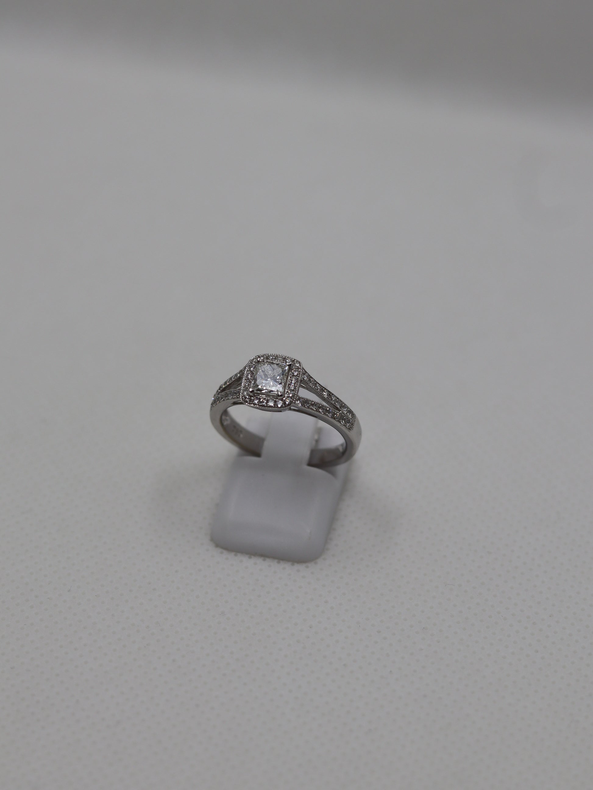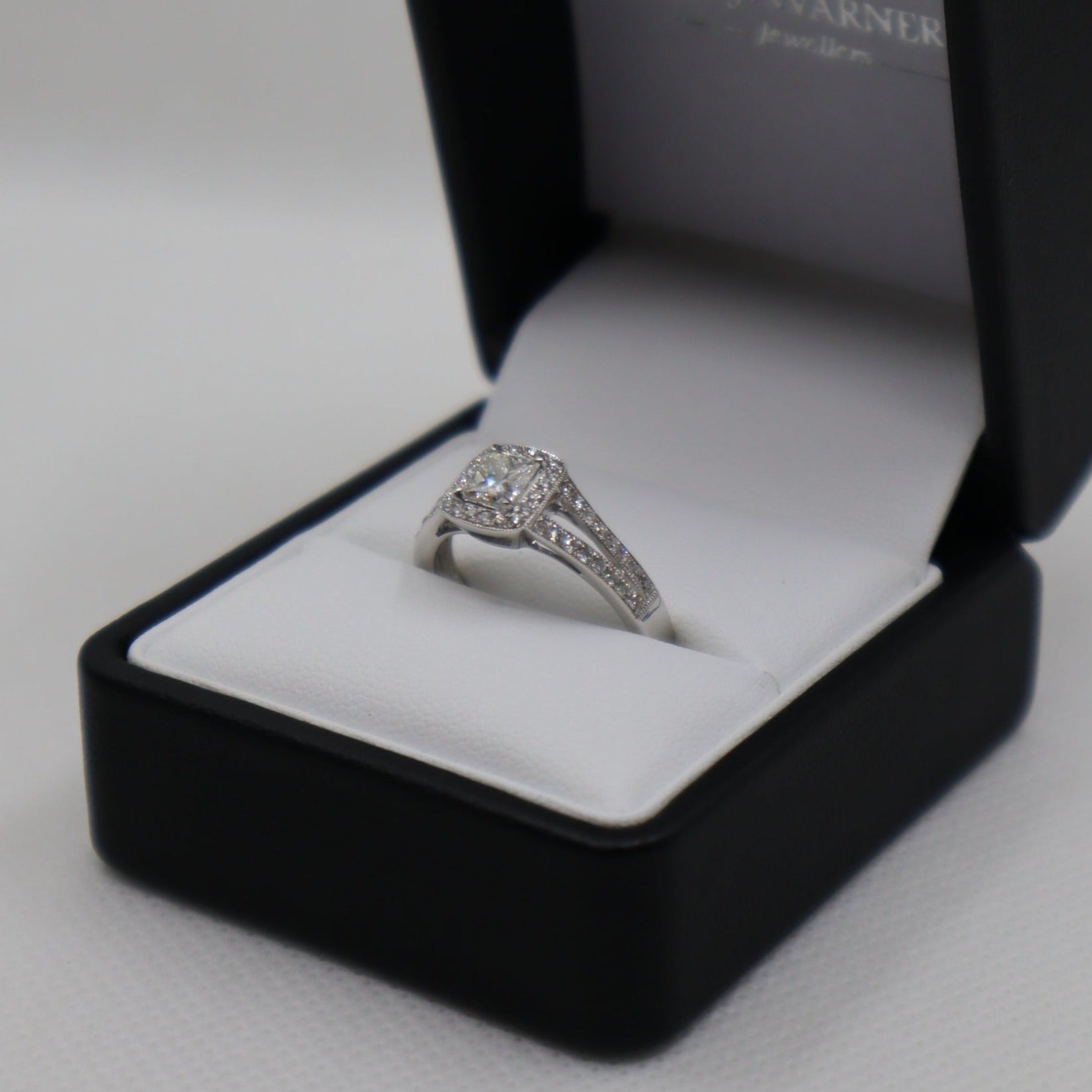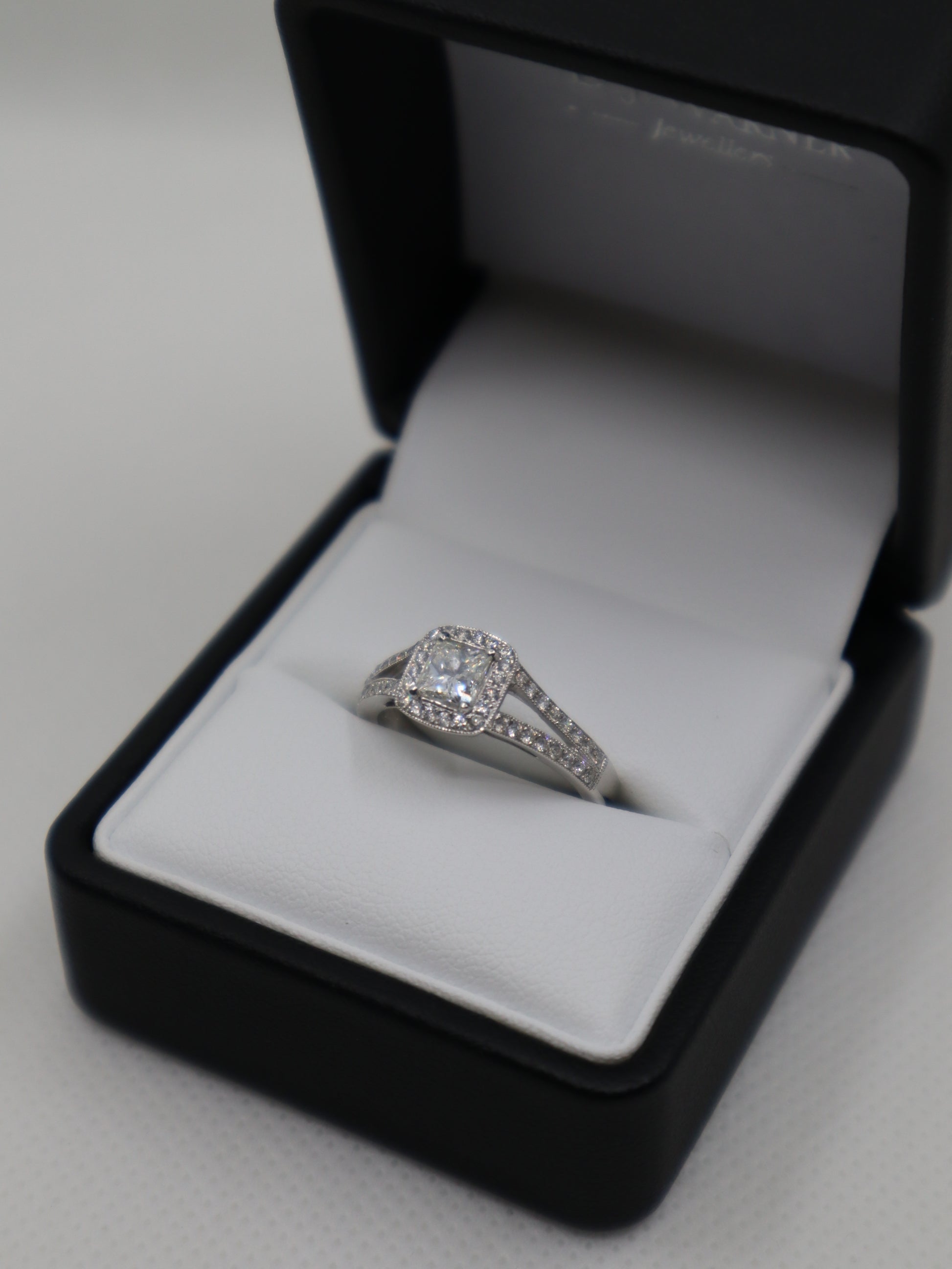 18ct white gold princess cut diamond halo ring. A single princess cut diamond in a four claw setting surrounded by a cushion shaped halo of 20 round brilliant cut diamonds in grain settings. The ring has split shoulders set with 32 further brilliant cut grain set diamonds.
