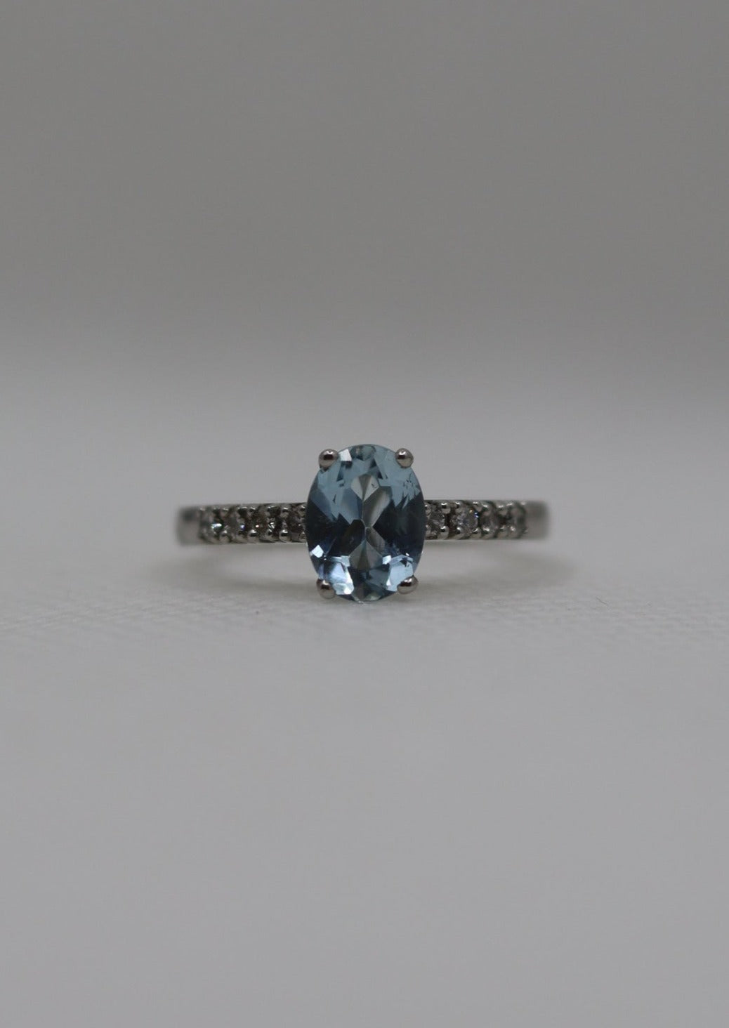 Platinum set aquamarine and diamond ring. A central oval aquamarine held in a 4 claw