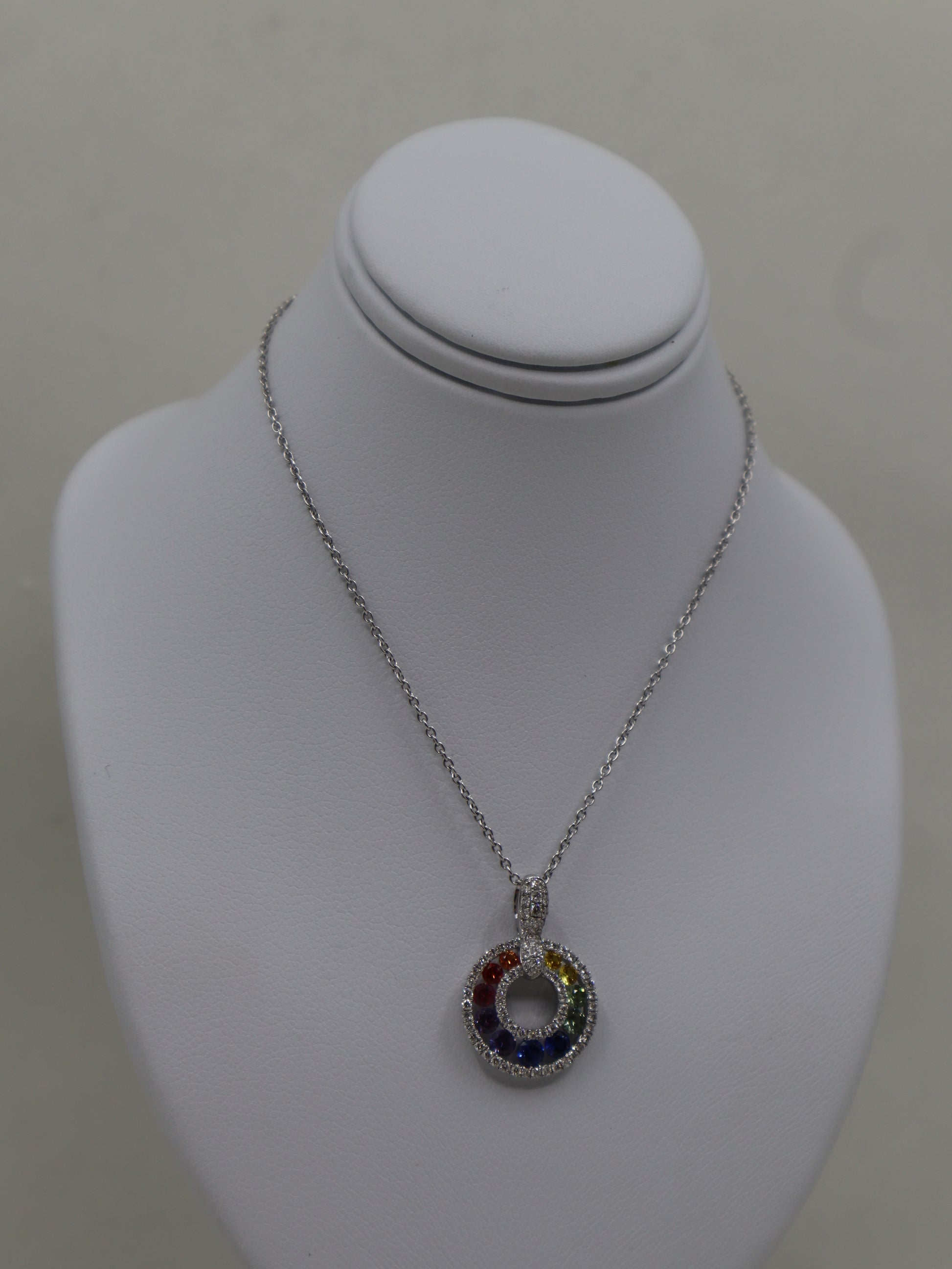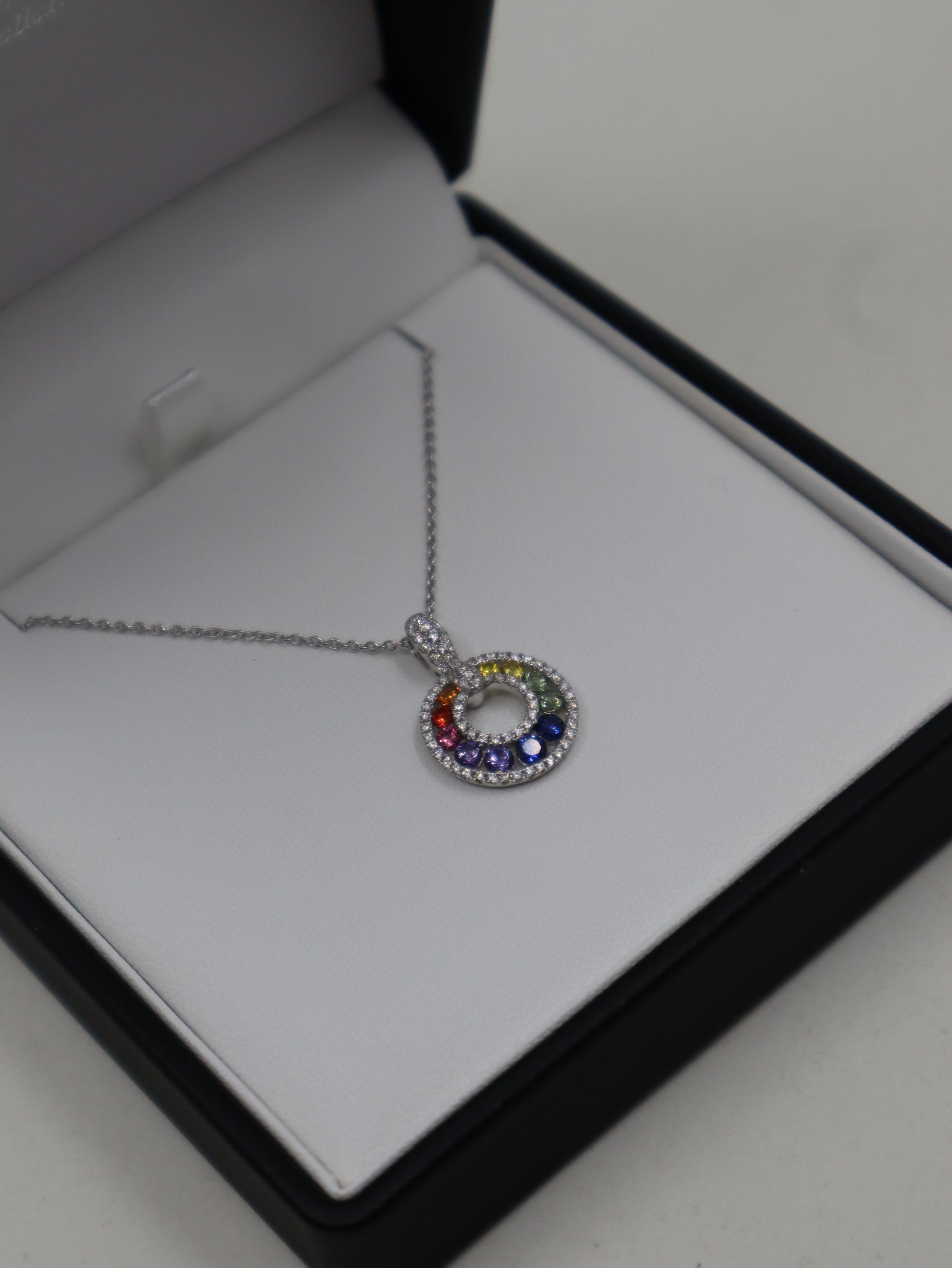 18ct white gold set sapphire and diamond pendant and chain. A open circle of 11 varying colour sapphires in a rainbow formation with a single row of diamonds above and below.