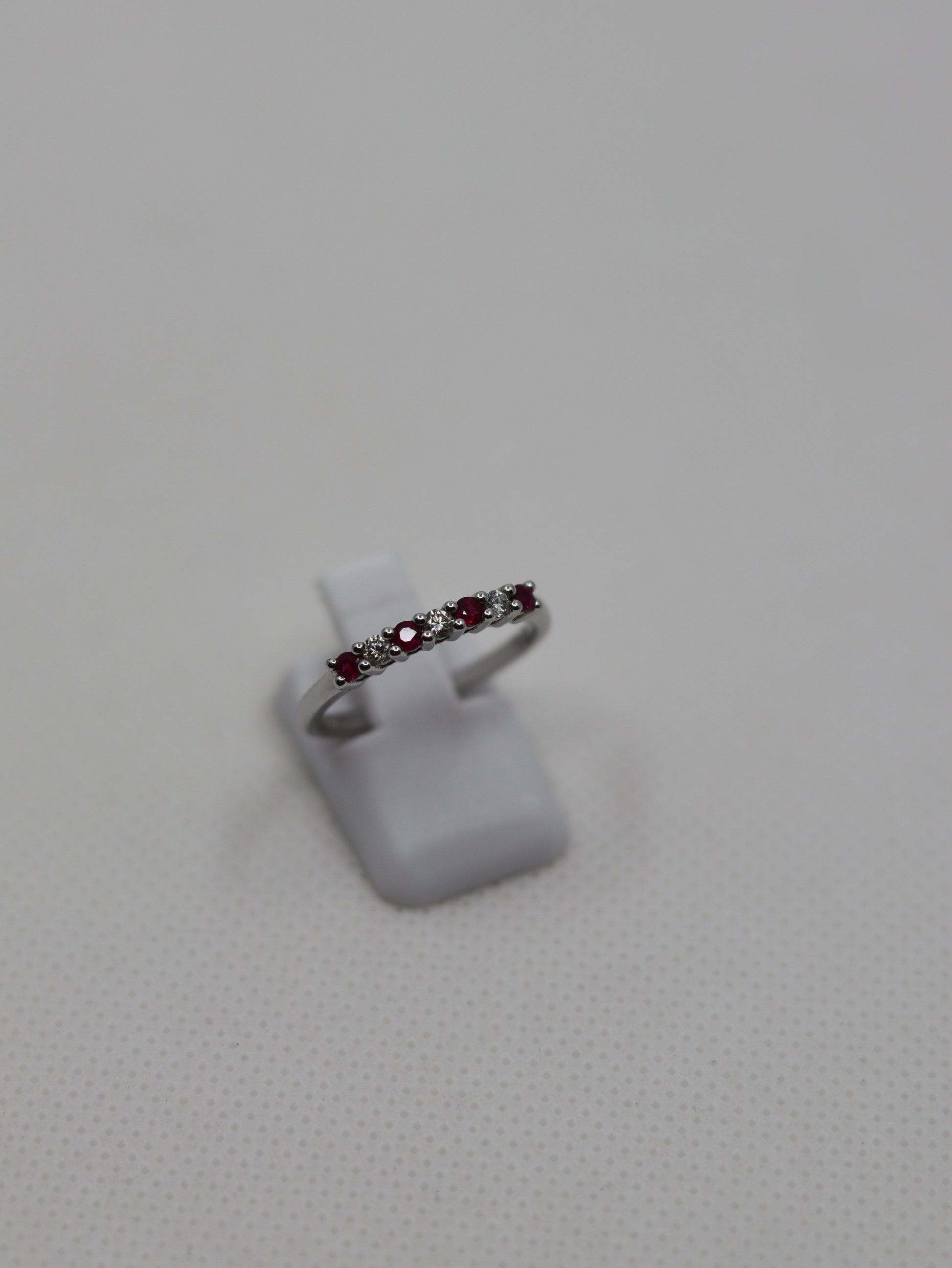 9ct white gold ruby and diamond set eternity ring. A single row of 4 mixed cut round rubies and 3 round brilliant cut diamonds in shared 4 claw settings to a plain shank.