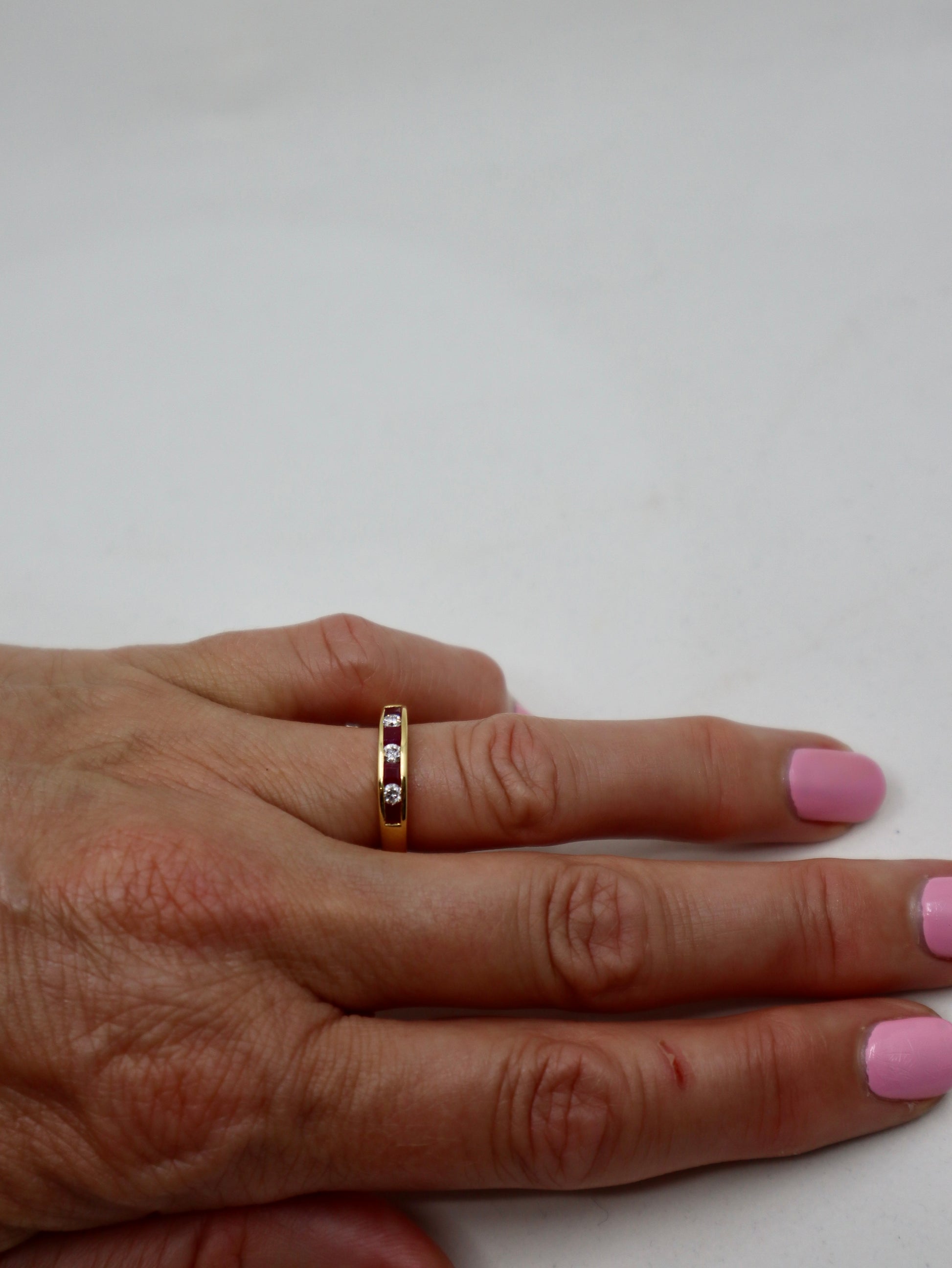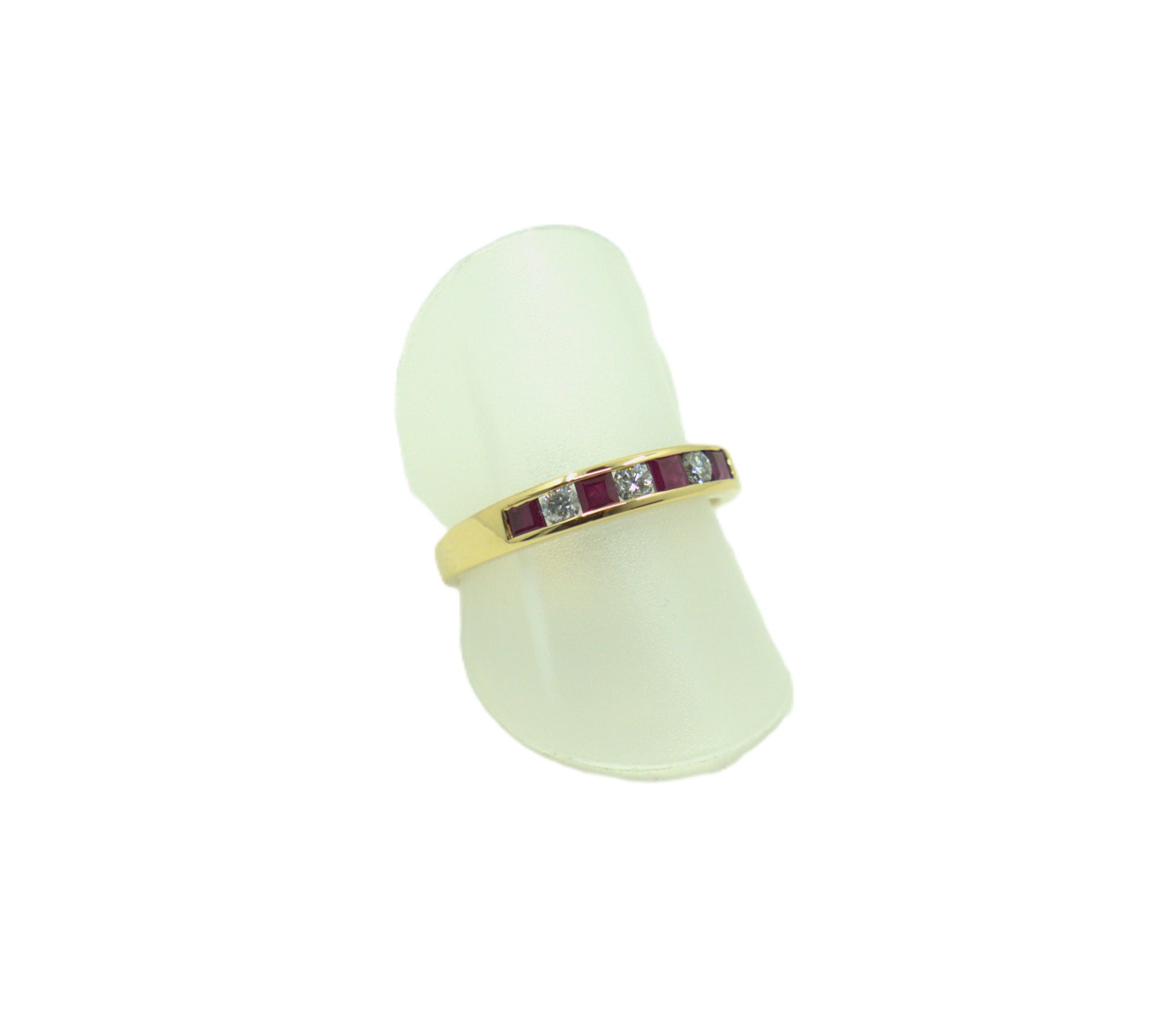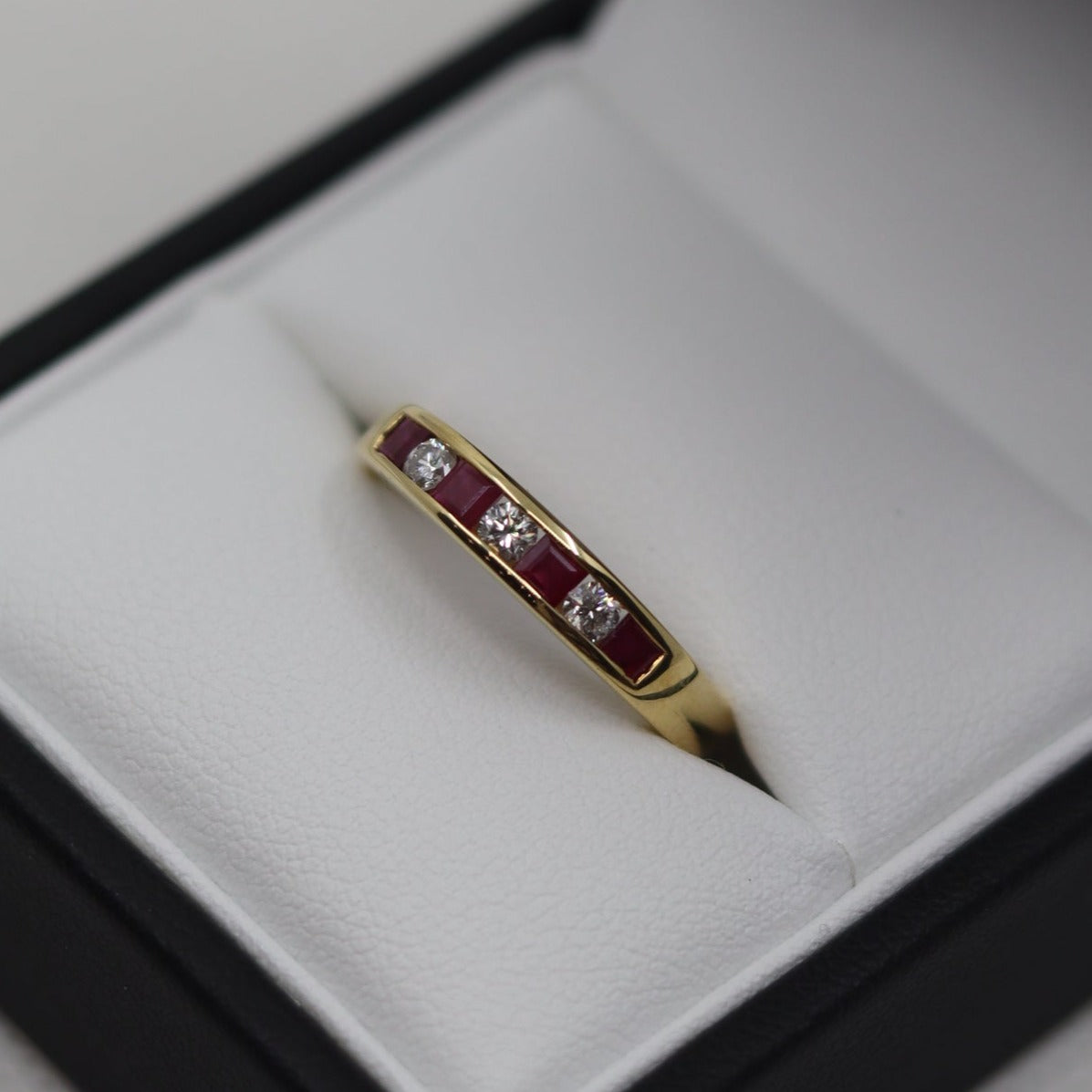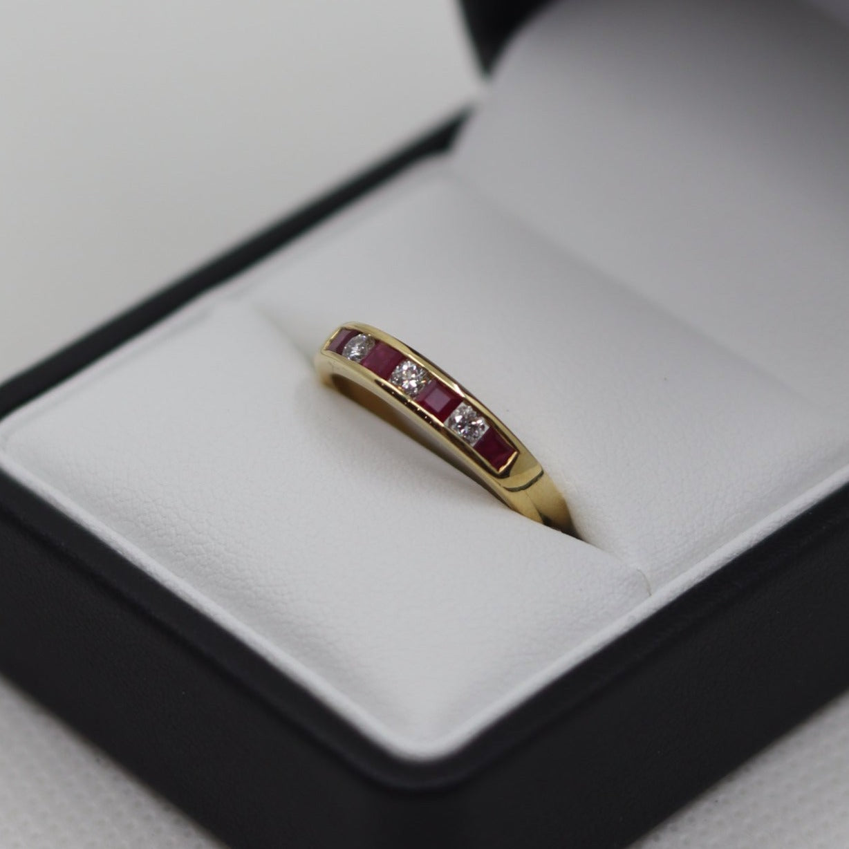 18ct yellow gold ruby and diamond eternity ring. A single channel setting set with 4 square cut rubies and 3 round brilliant cut diamonds to a plain shank.