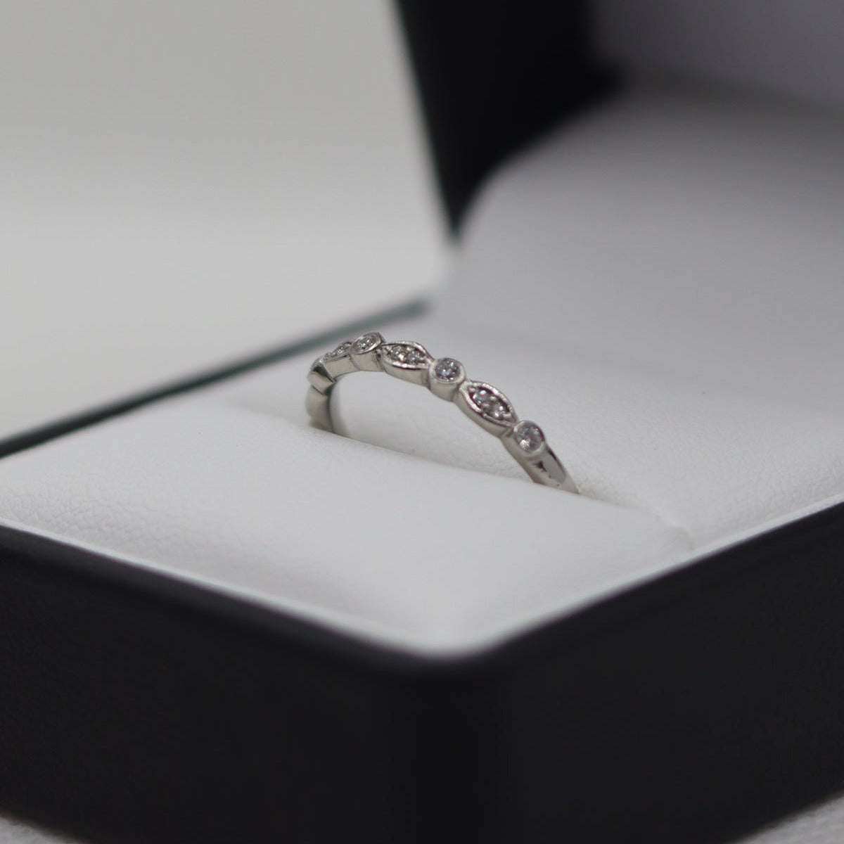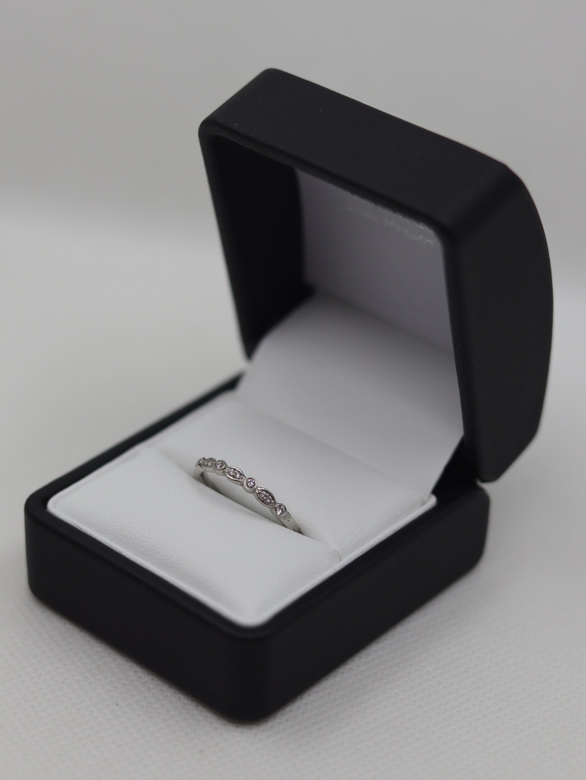 Platinum diamond eternity ring. A single row of alternating 5 round and 4 marquise shapes. The round shapes are individual brilliant cut bezel set diamonds and the marquise shape is grain set with 2 small brilliant cut diamonds.