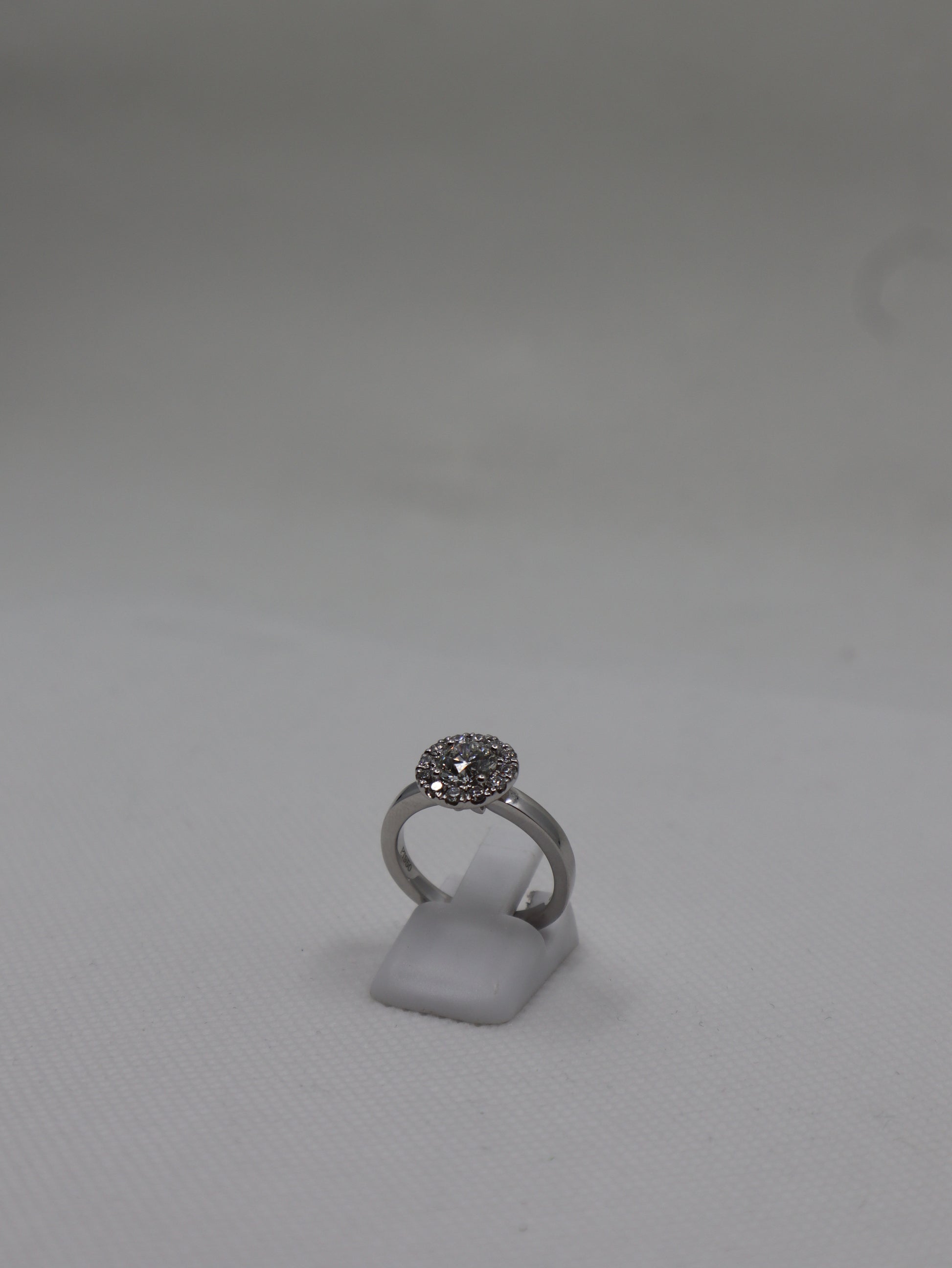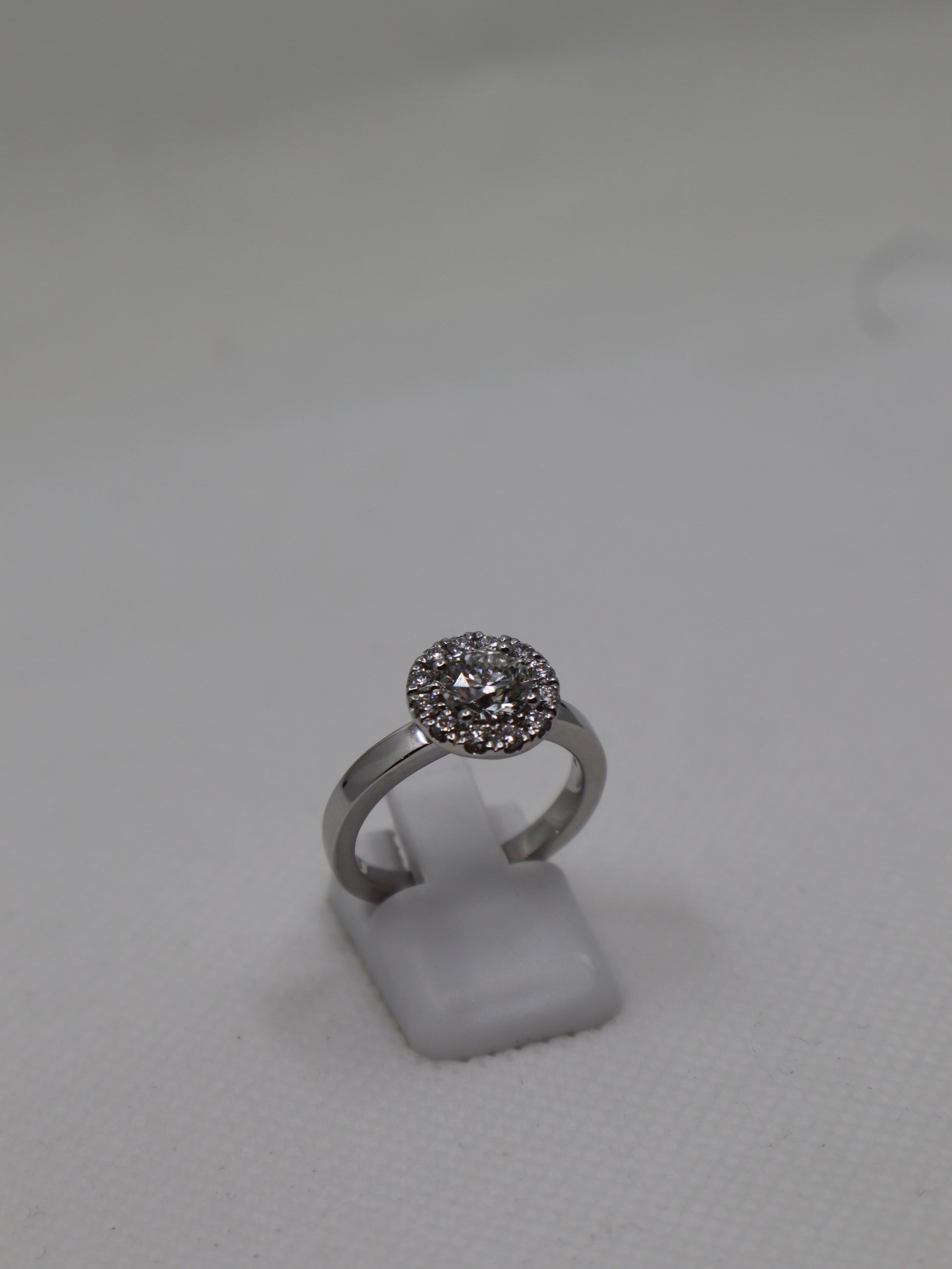 A platinum diamond set cluster style ring. A central round brilliant cut diamond surrounded by a halo of 12 further smaller round brilliant cut diamonds all held by claw settings. Centre diamond GIA certificated 1ct, G colour, Vs clarity surrounding diamonds 0.35ct.