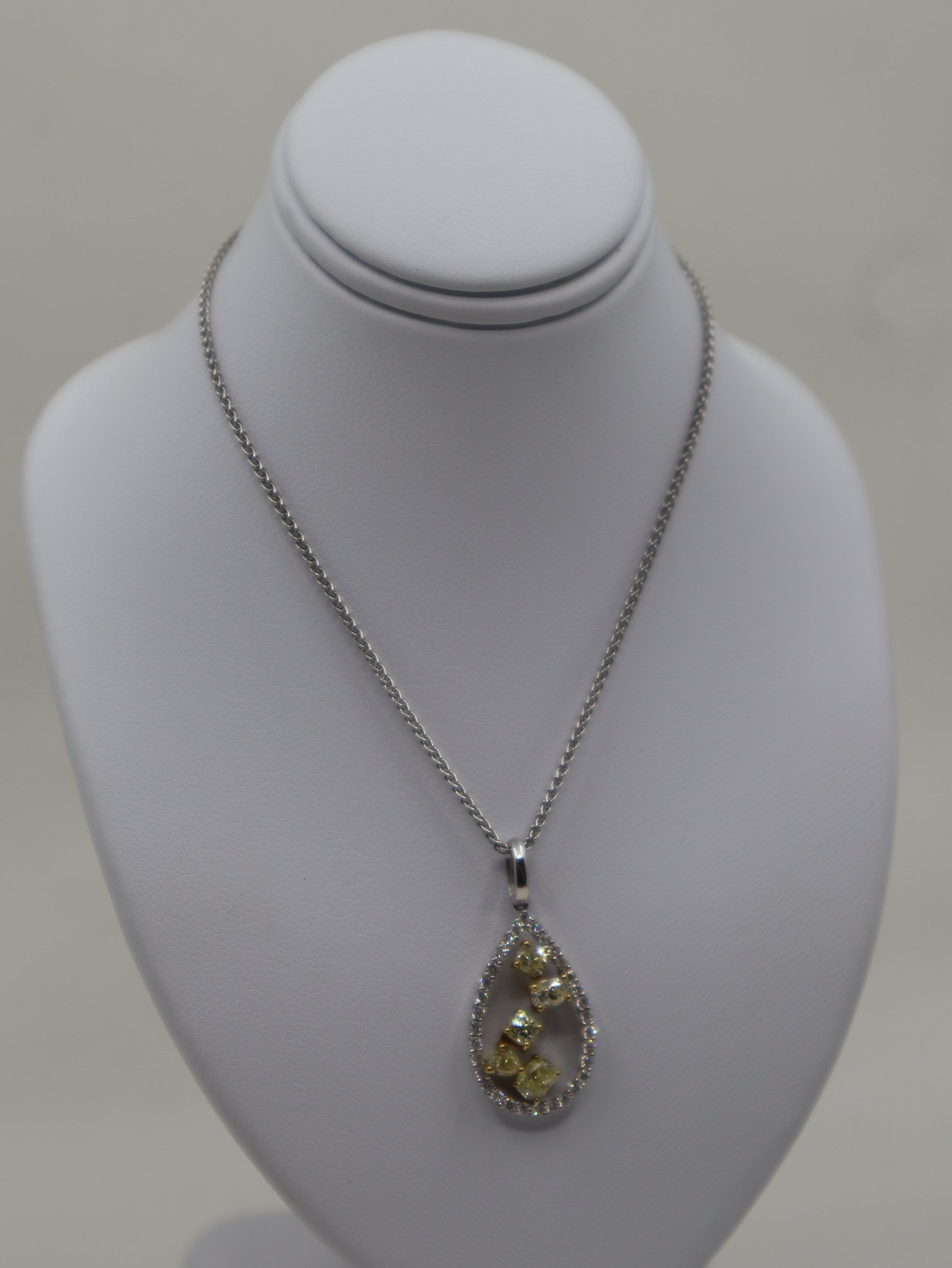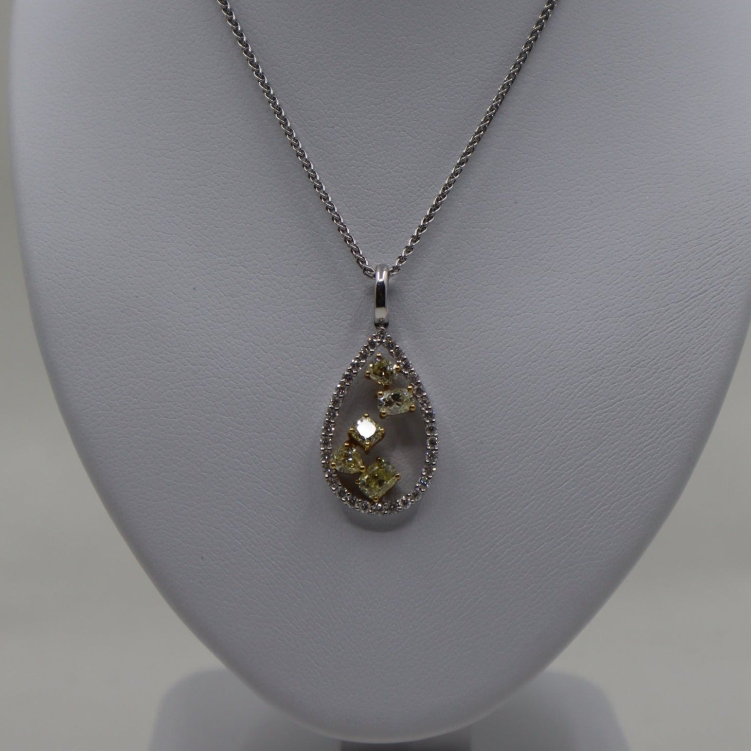 The yellow diamonds are all different shapes including pear, square cushion, oval and rectangular cushion cuts. The pendant hangs on an 18ct white 16 inch/40cm Spiga link chain. Yellow diamond total weight 1.19ct, white diamond total weight 0.37ct
