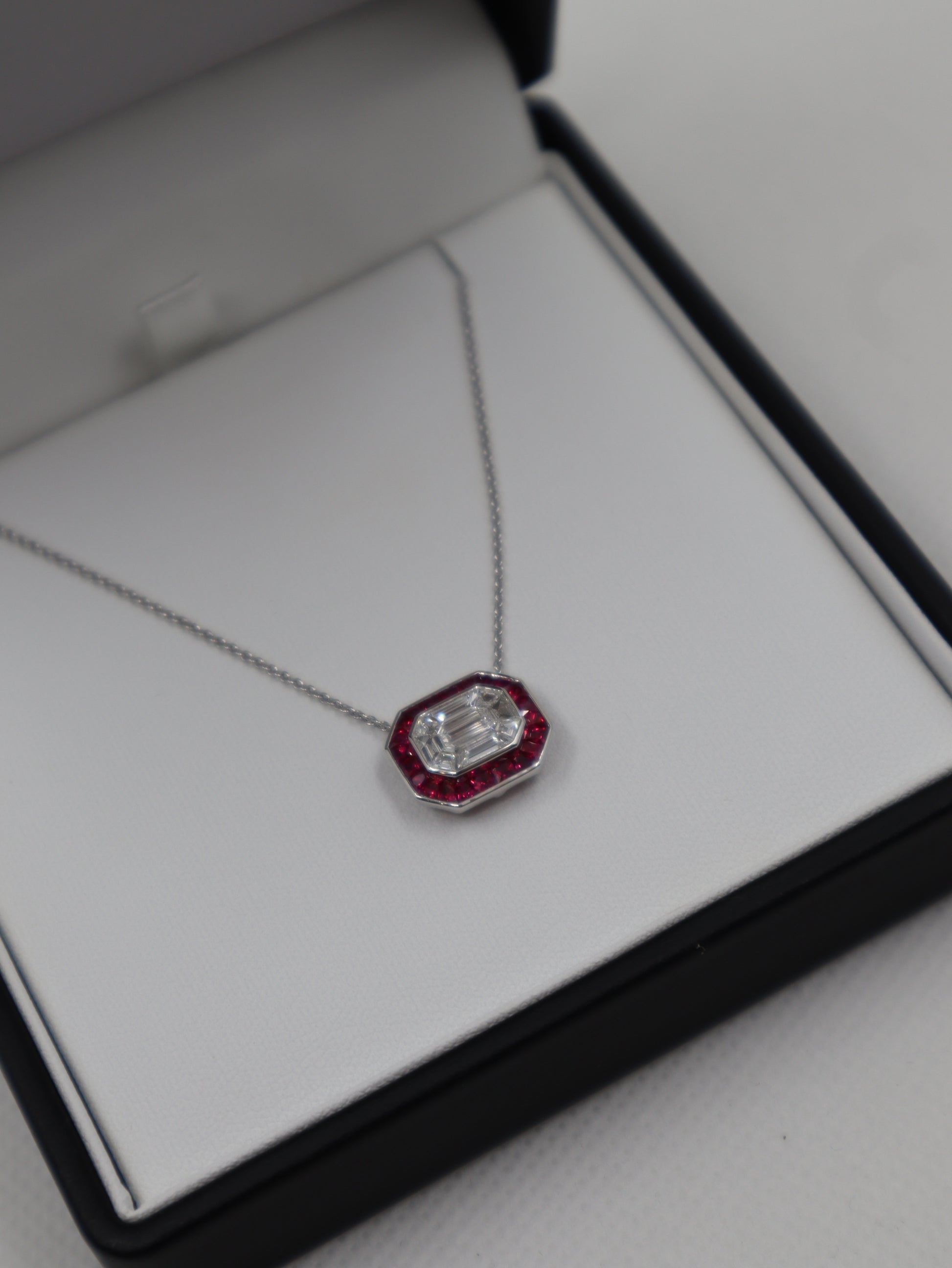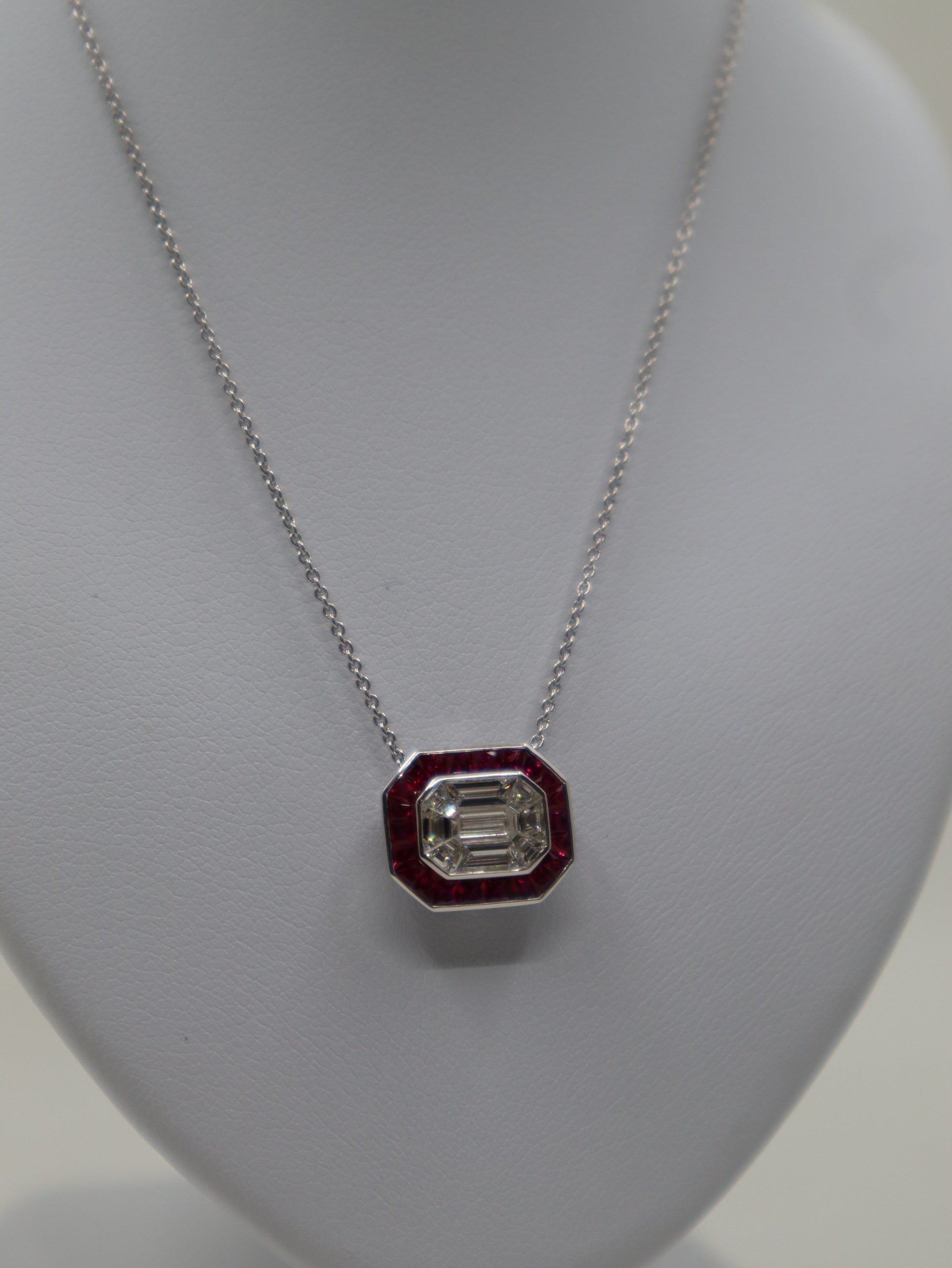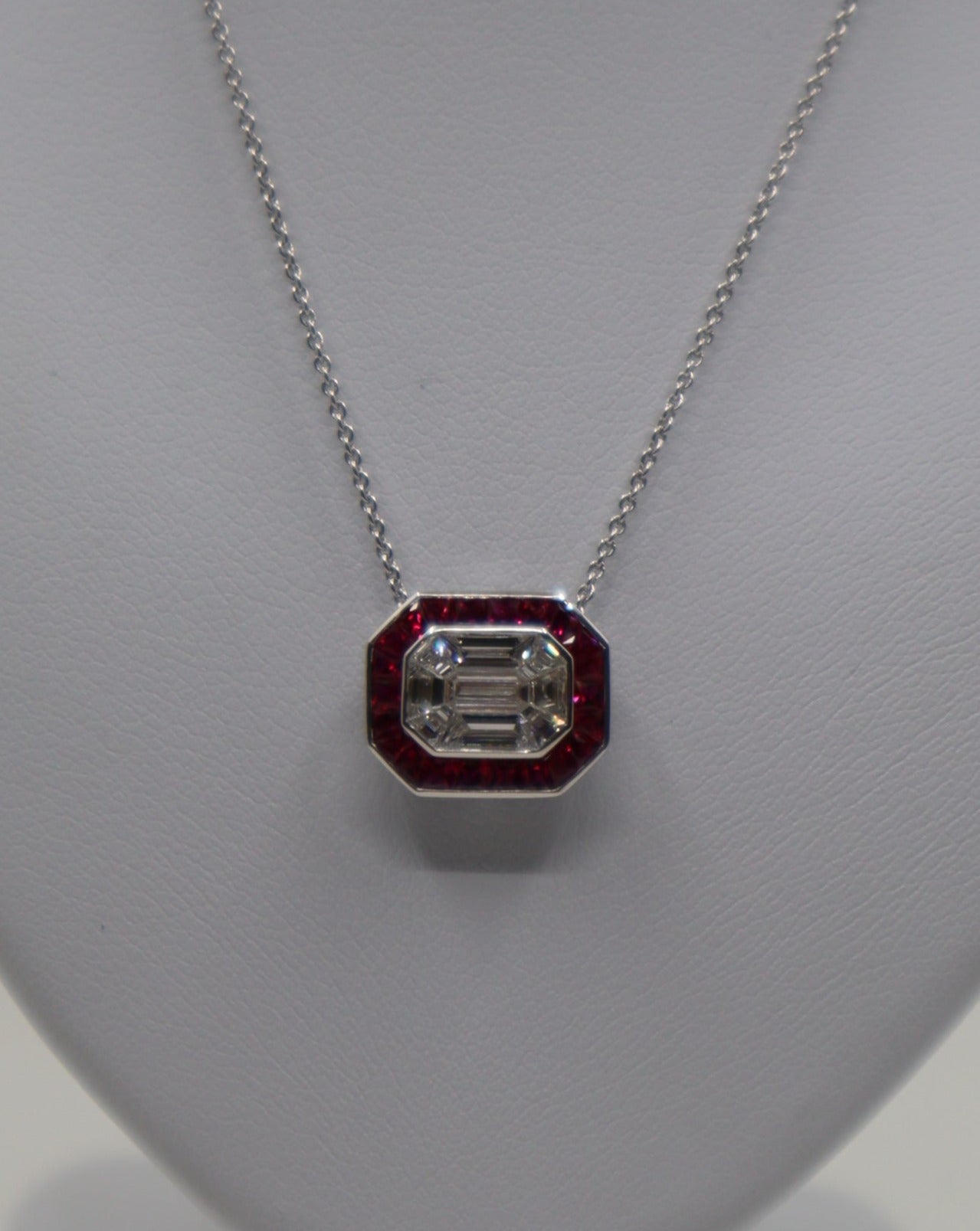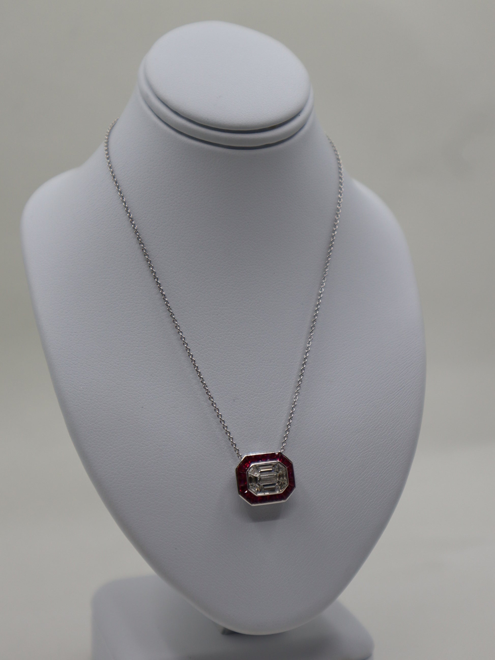 18ct white gold ruby and diamond set pendant and chain. An illusion setting of 9 specially cut diamonds to look like a single emerald cut diamond surrounded by a single row of specially cut square rubies in a channel setting. The pendant hangs on a fine 16 inch/40cm trace chain. Diamond weight 0.56ct, ruby weight 1.25ct.