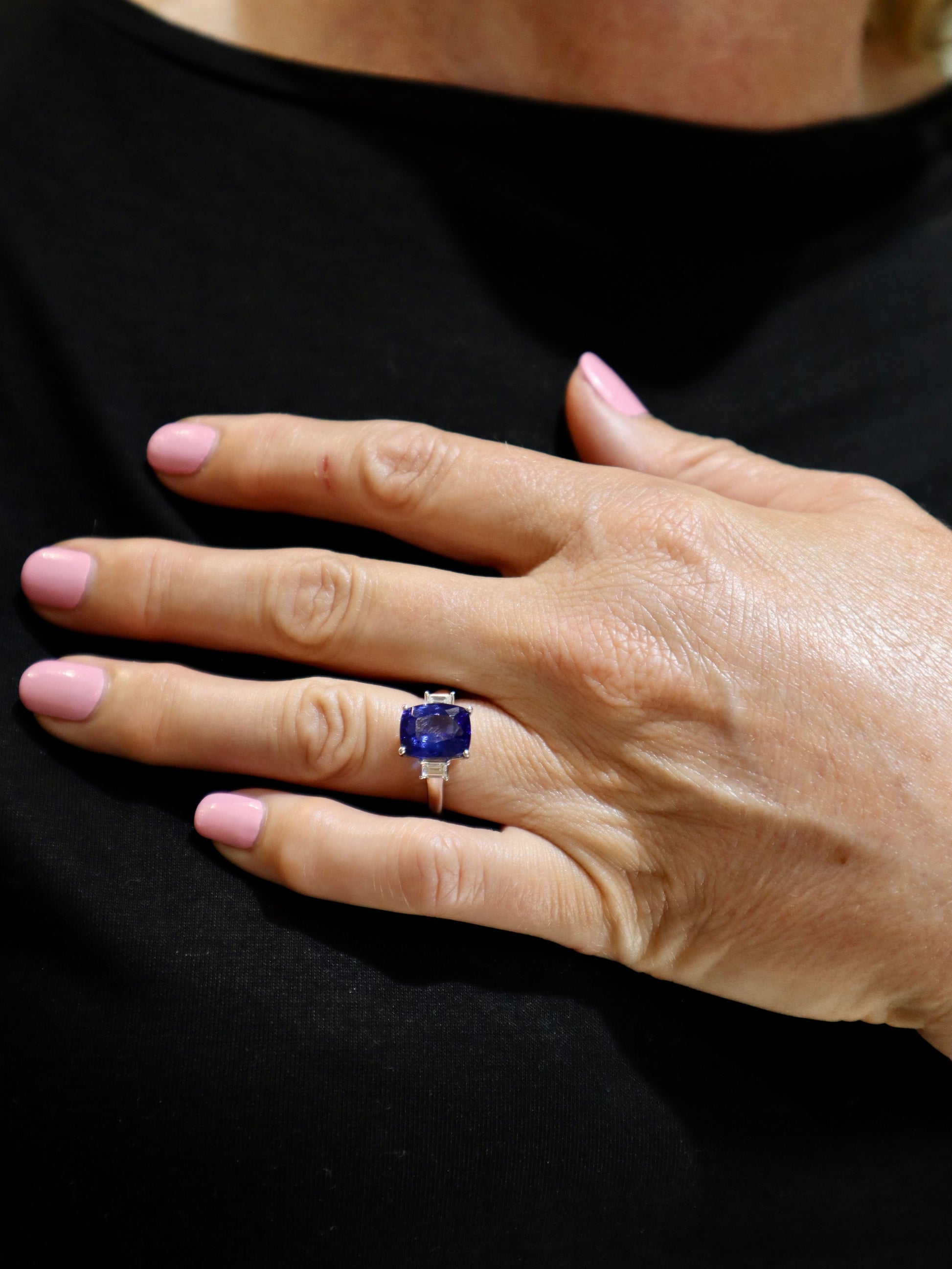 tanzanite in a 4 claw setting with a single baguette cut diamond set either side to a plain shank. Tanzanite 4.93ct Diamond weight 0.32ct.