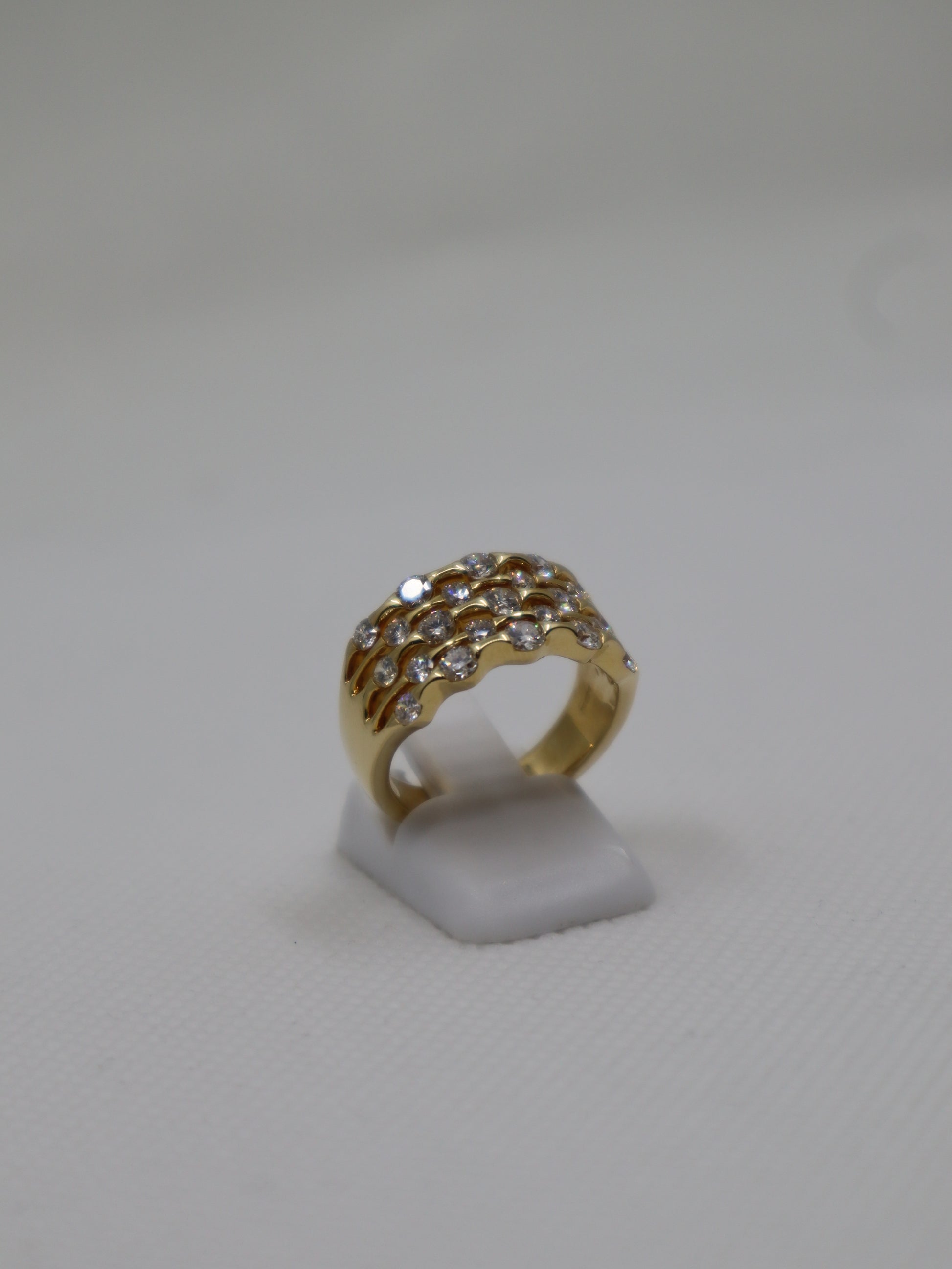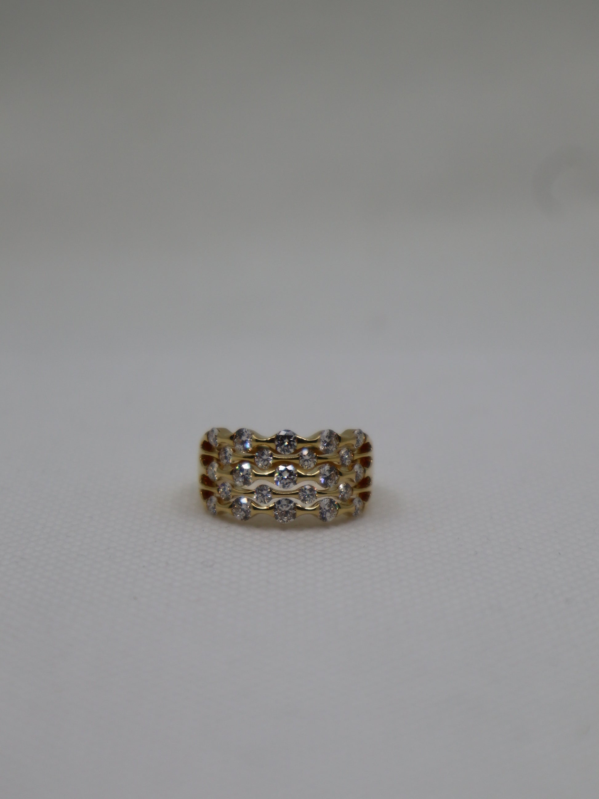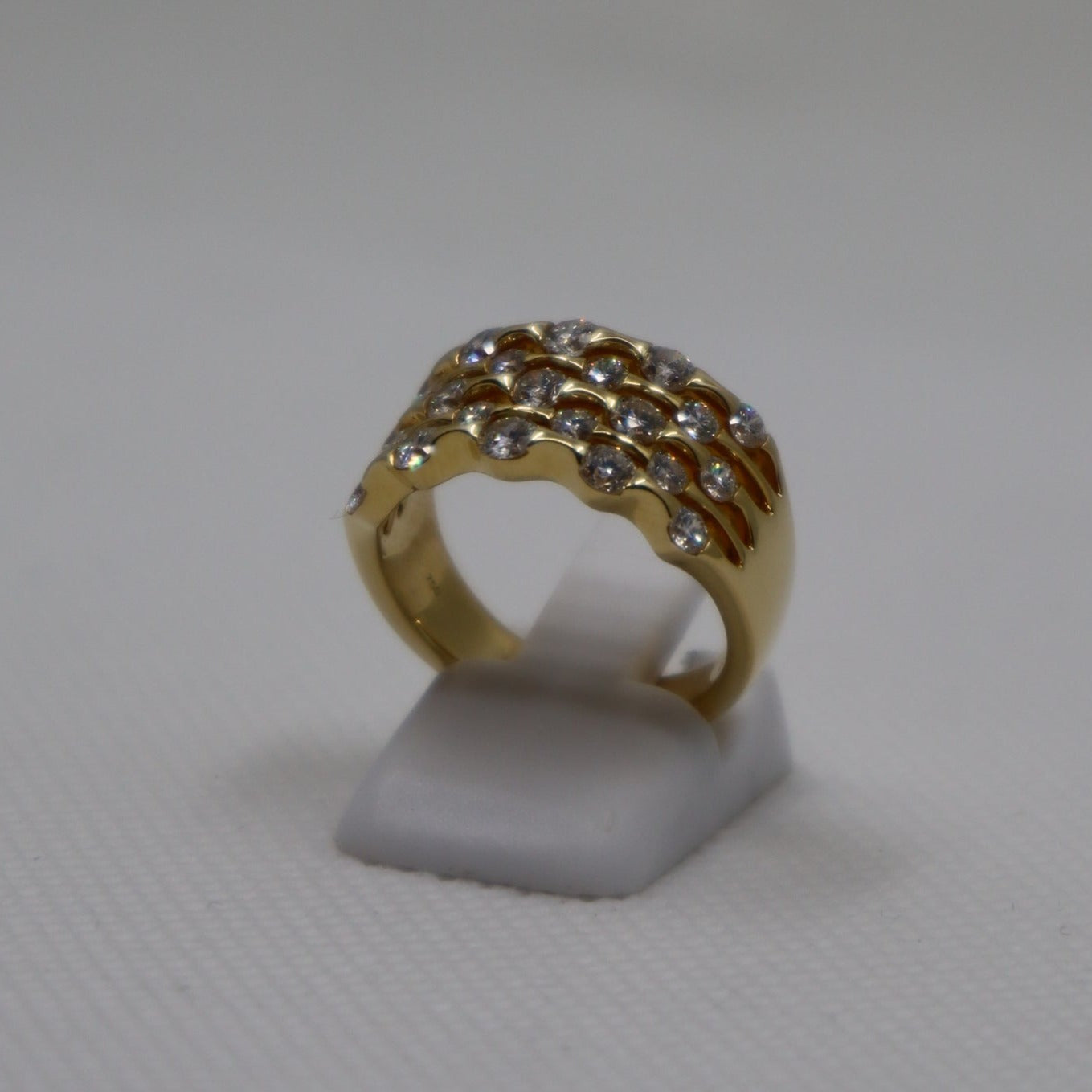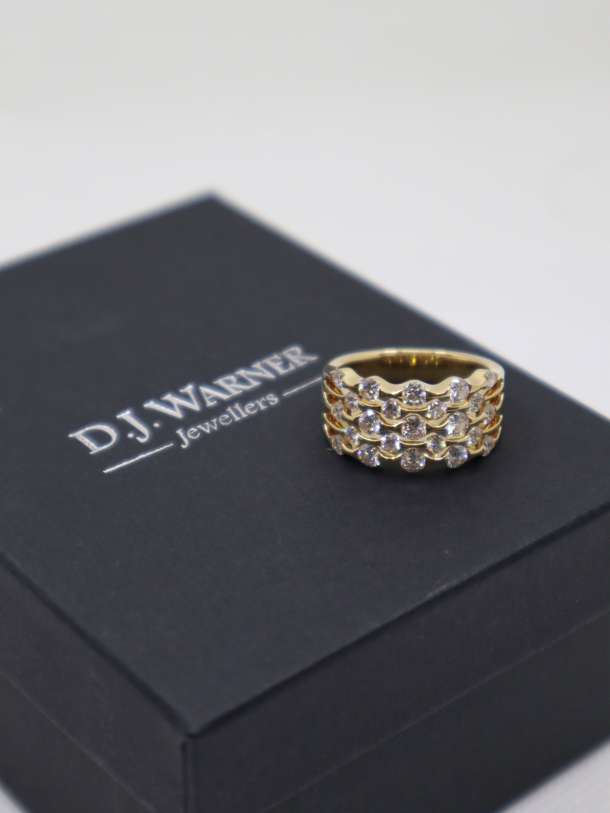 18ct yellow gold 5 row diamond eternity style dress ring. Comprising of alternate rows of larger and smaller brilliant cut diamonds in tension settings to a plain shank. Diamond total weight 1.52ct.