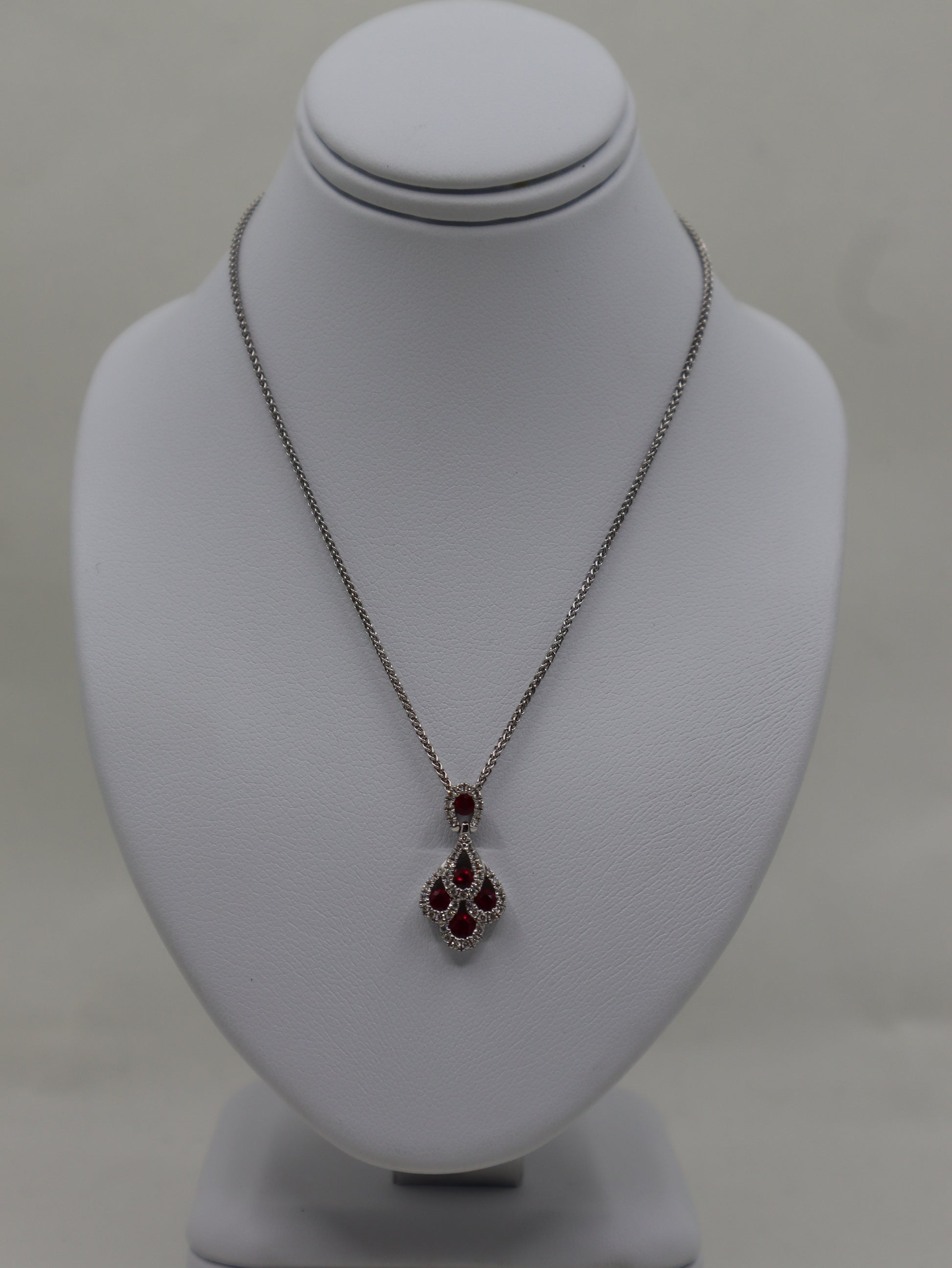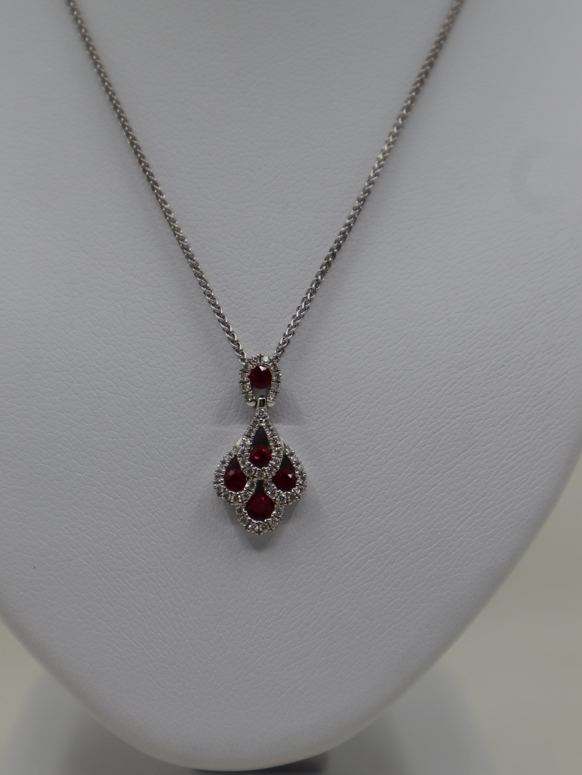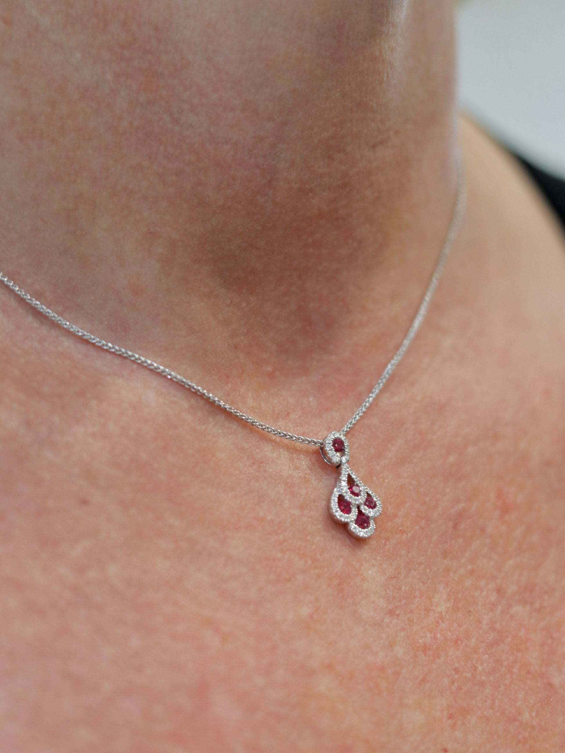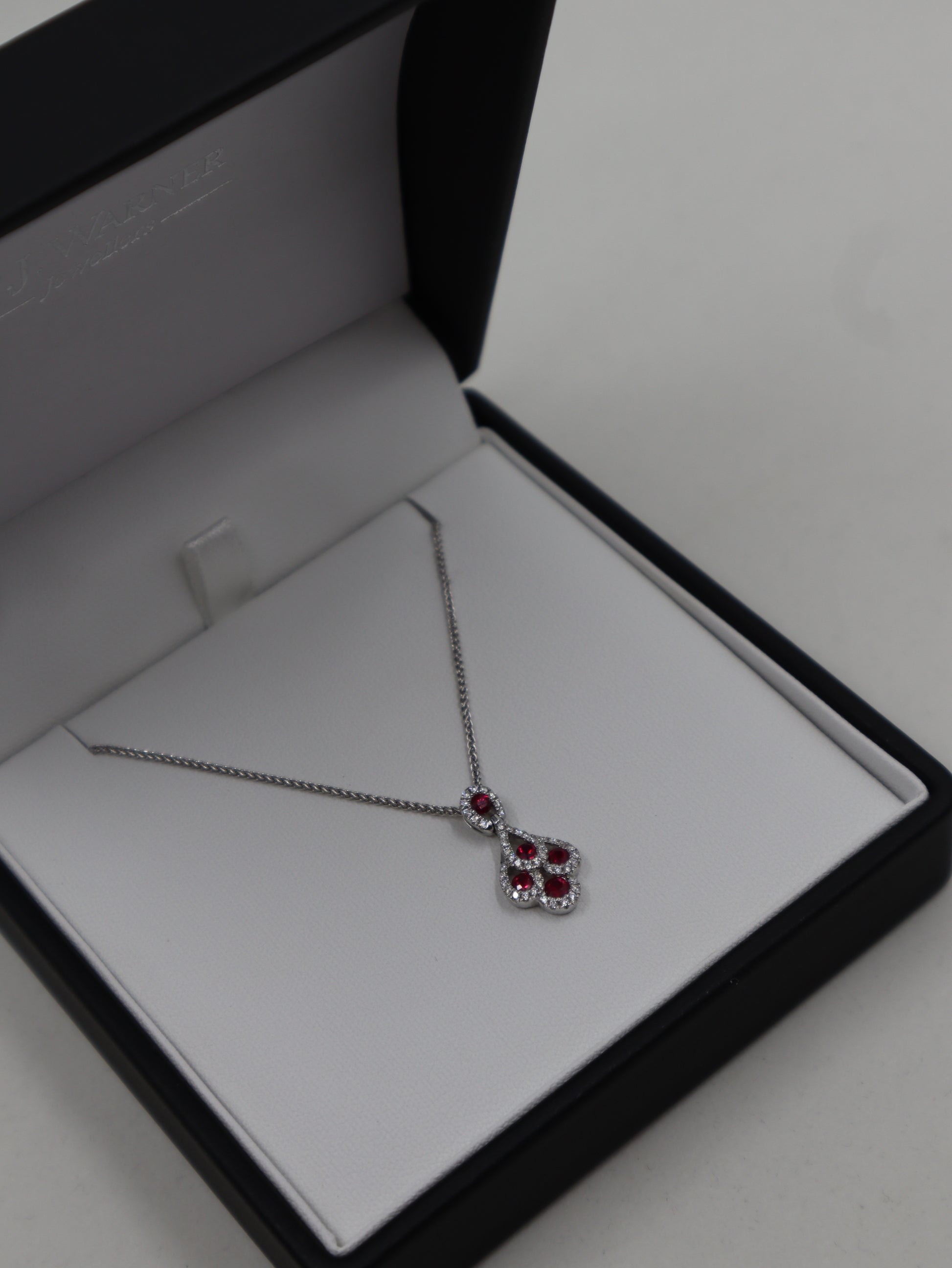 18ct white gold ruby and diamond set drop pendant and chain. 4 overlaying open diamond set pear shapes with a single round mixed cut ruby set at the bottom of each pear shape. This hangs below a single ruby surrounded by diamonds with the chain fitted in behind.