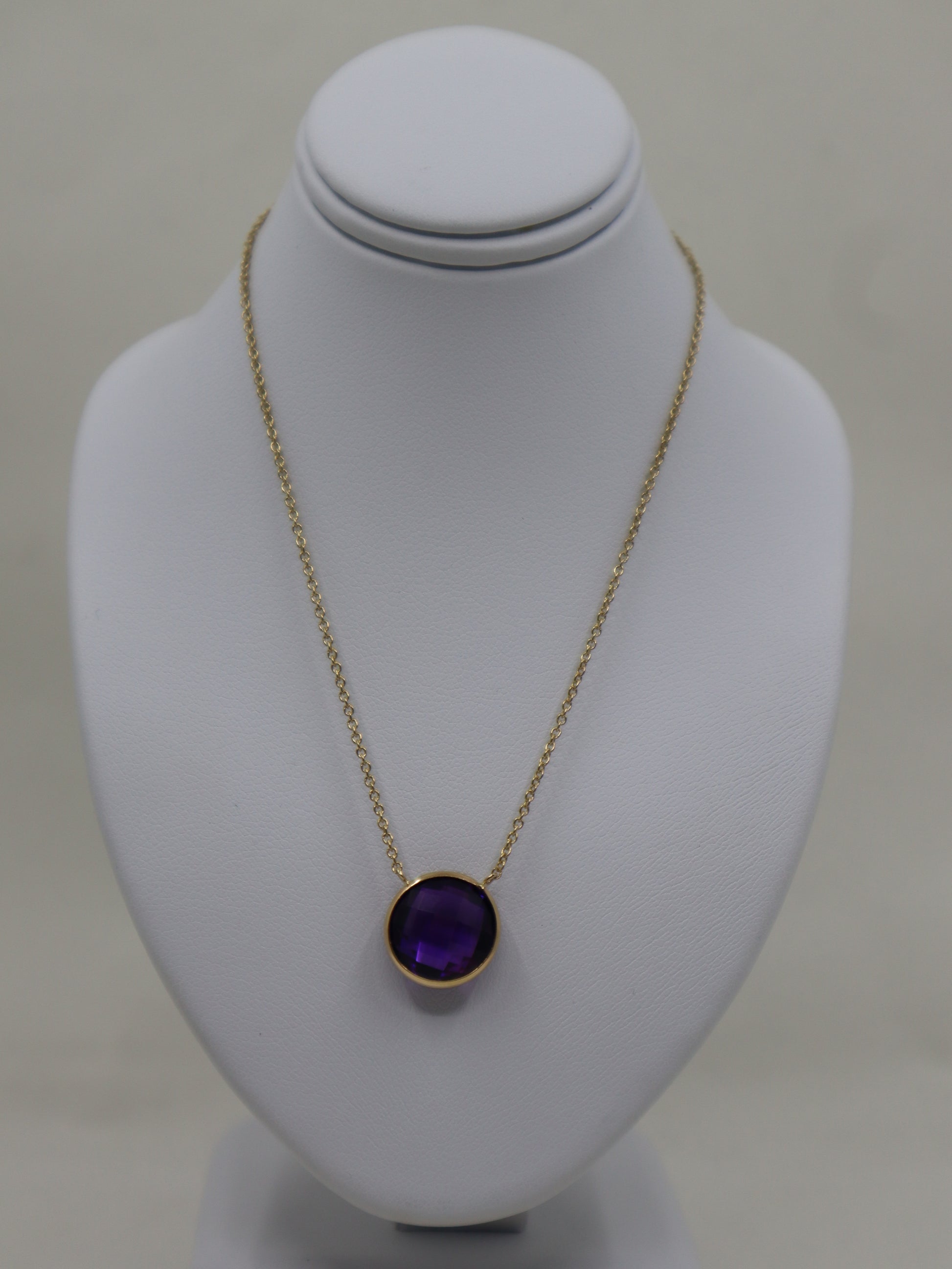 9ct yellow gold amethyst pendant and chain. A single stone round 12mm chequerboard faceted amethyst in a bezel setting with a fixed fine trace link chain.