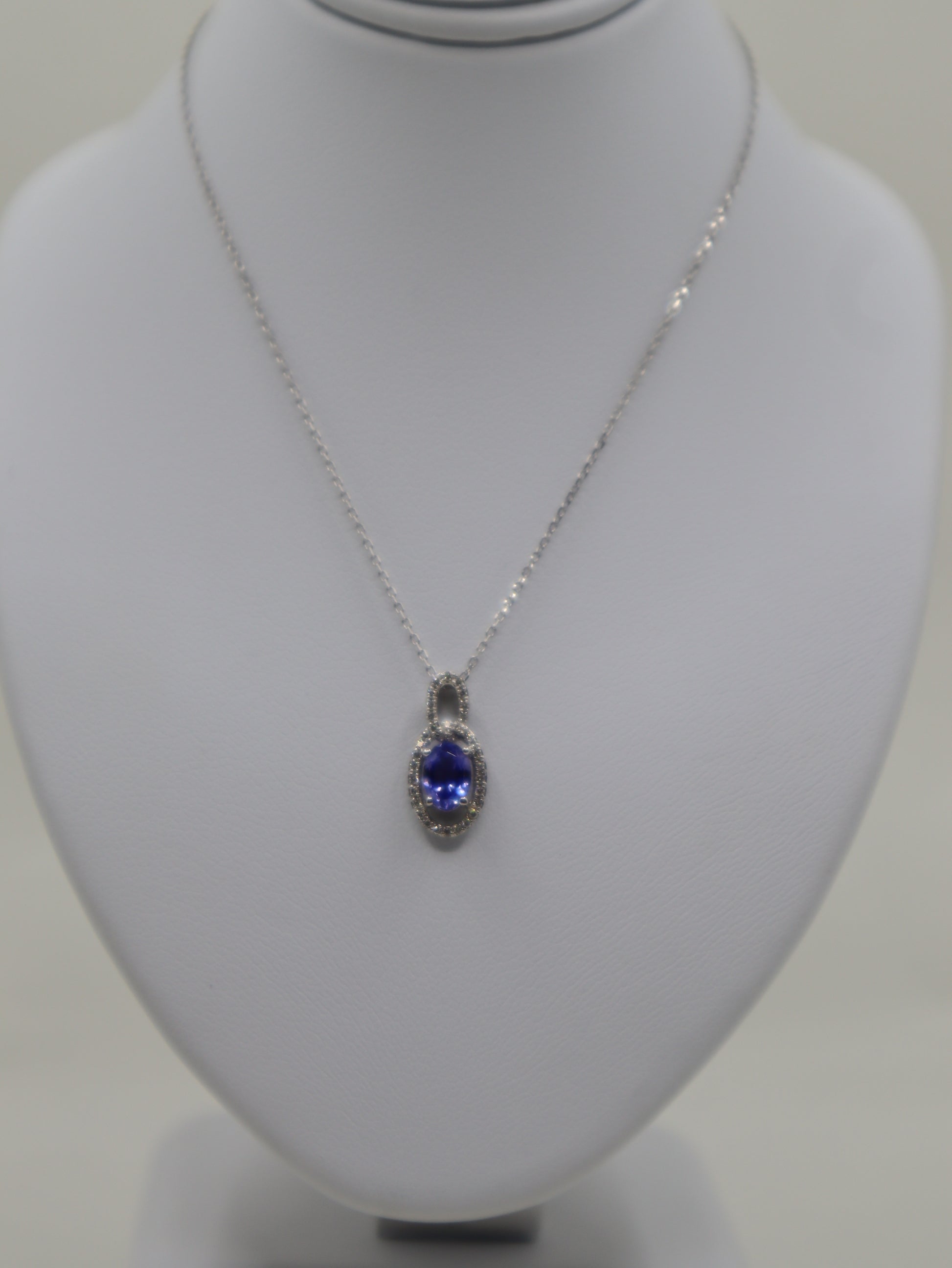 9ct white gold tanzanite and diamond set pendant and chain. A single oval tanzanite in a 4 claw setting surrounded by a halo of diamonds and a smaller open oval of diamonds above. The pendant hangs on a fine 9ct white gold trace chain 18 inch/45cm. Tanzanite weight 0.55ct diamond total weight 0.09ct.