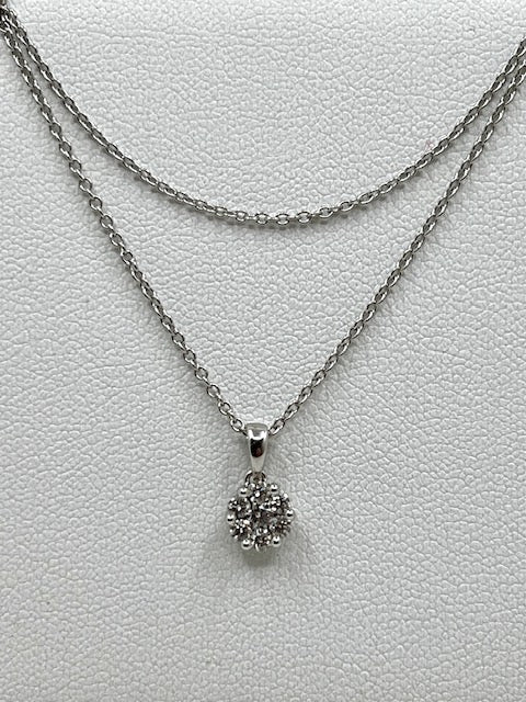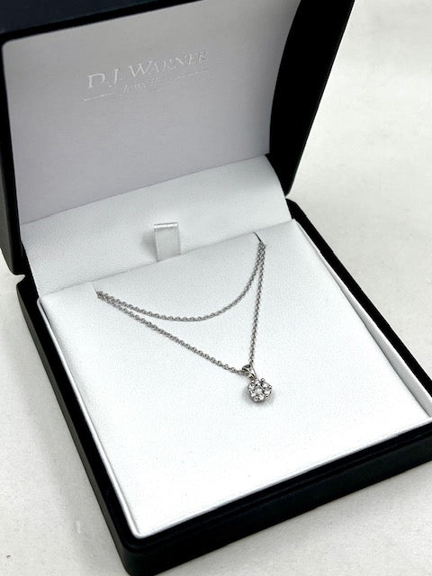 18ct white gold diamond set pendant and chain. 7 round brilliant cut diamonds set in an illusion cluster to imitate a solitaire diamond pendant. A bale above and hangs on a 16-18 inch adjustable trace link chain. Total diamond weight 0.25ct.