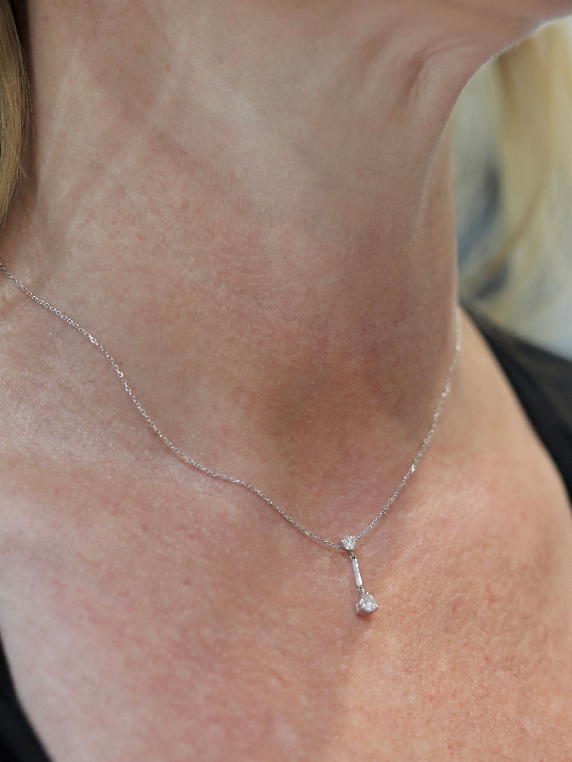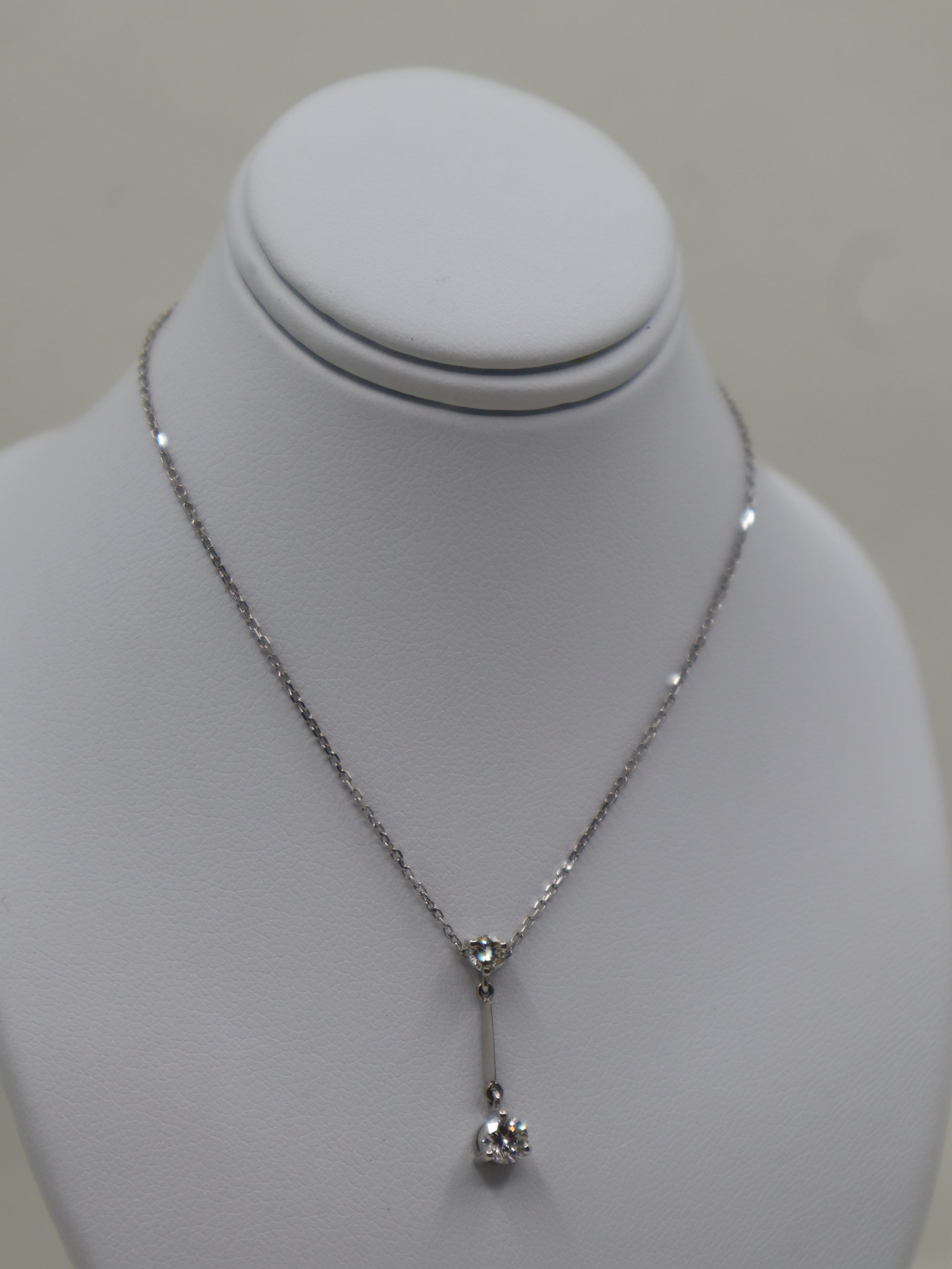 18ct white gold diamond drop pendant and chain. A single round brilliant cut diamond with a larger round brilliant cut diamond bellow separated by a white gold thin bar. The top diamond has a fine white gold trace chain fitted to each side. Chain length 16inch/40cm, diamond weight 0.34ct.
