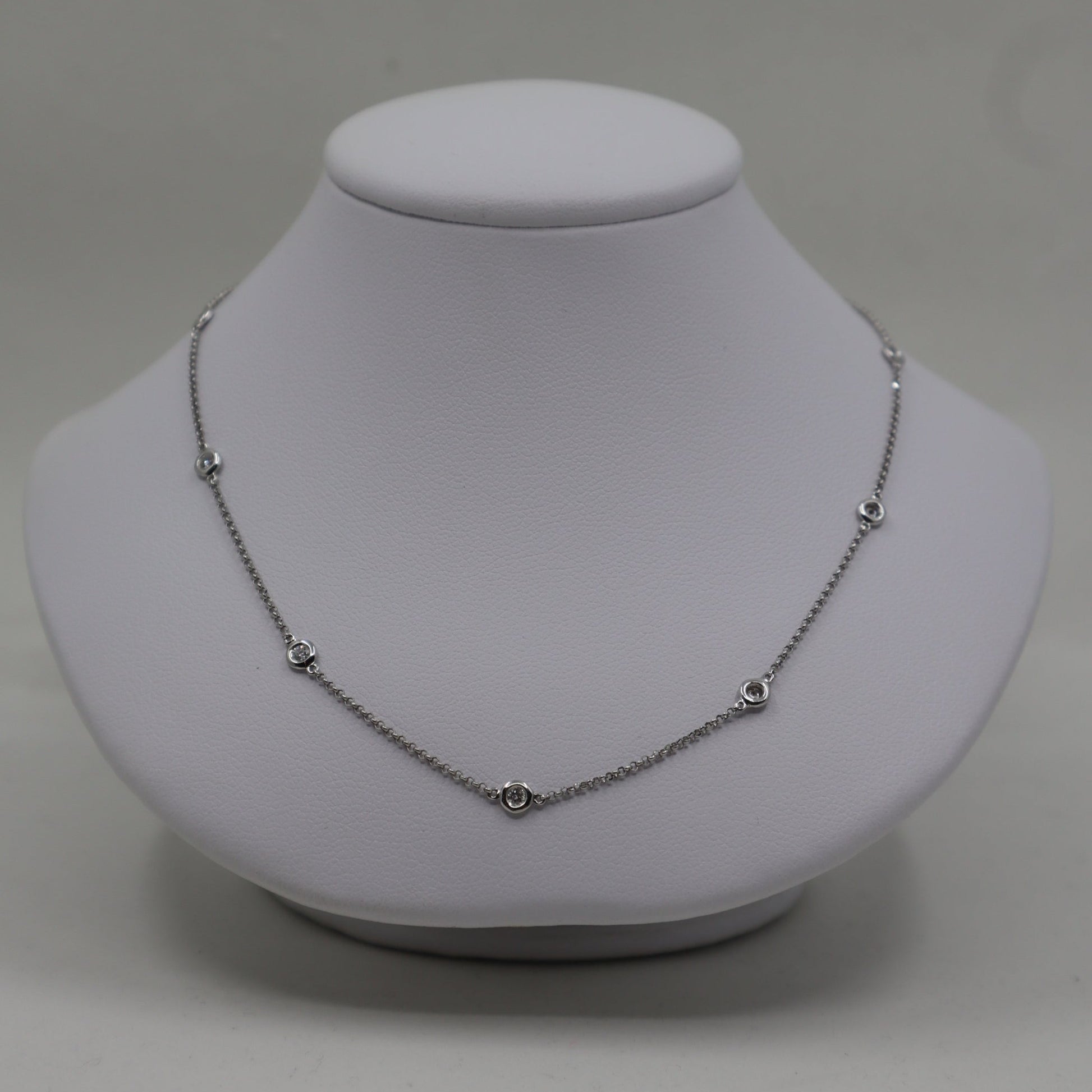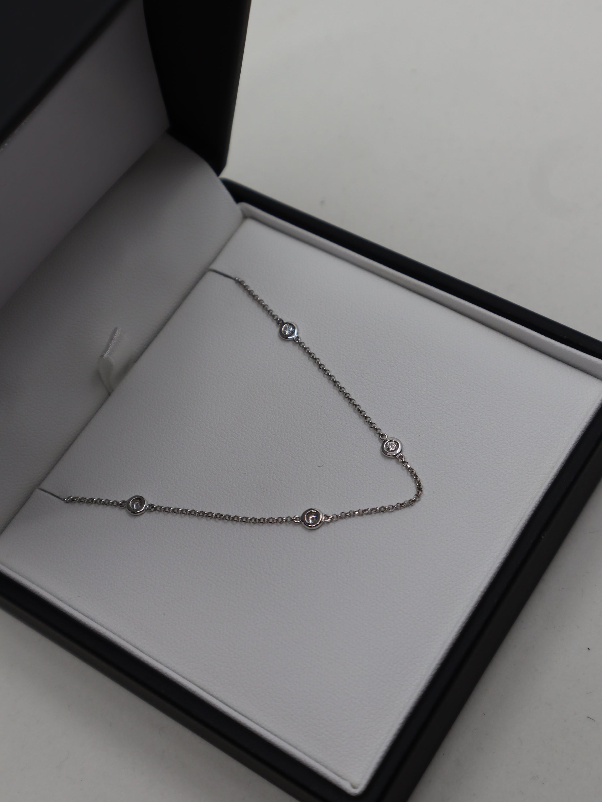 18ct white gold diamond set necklet. A 16 inch/40cm length fine chain set with 14 round brilliant cut diamonds all bezel set and approximately 3cm apart around the chain. Total diamond weight 0.45ct.
