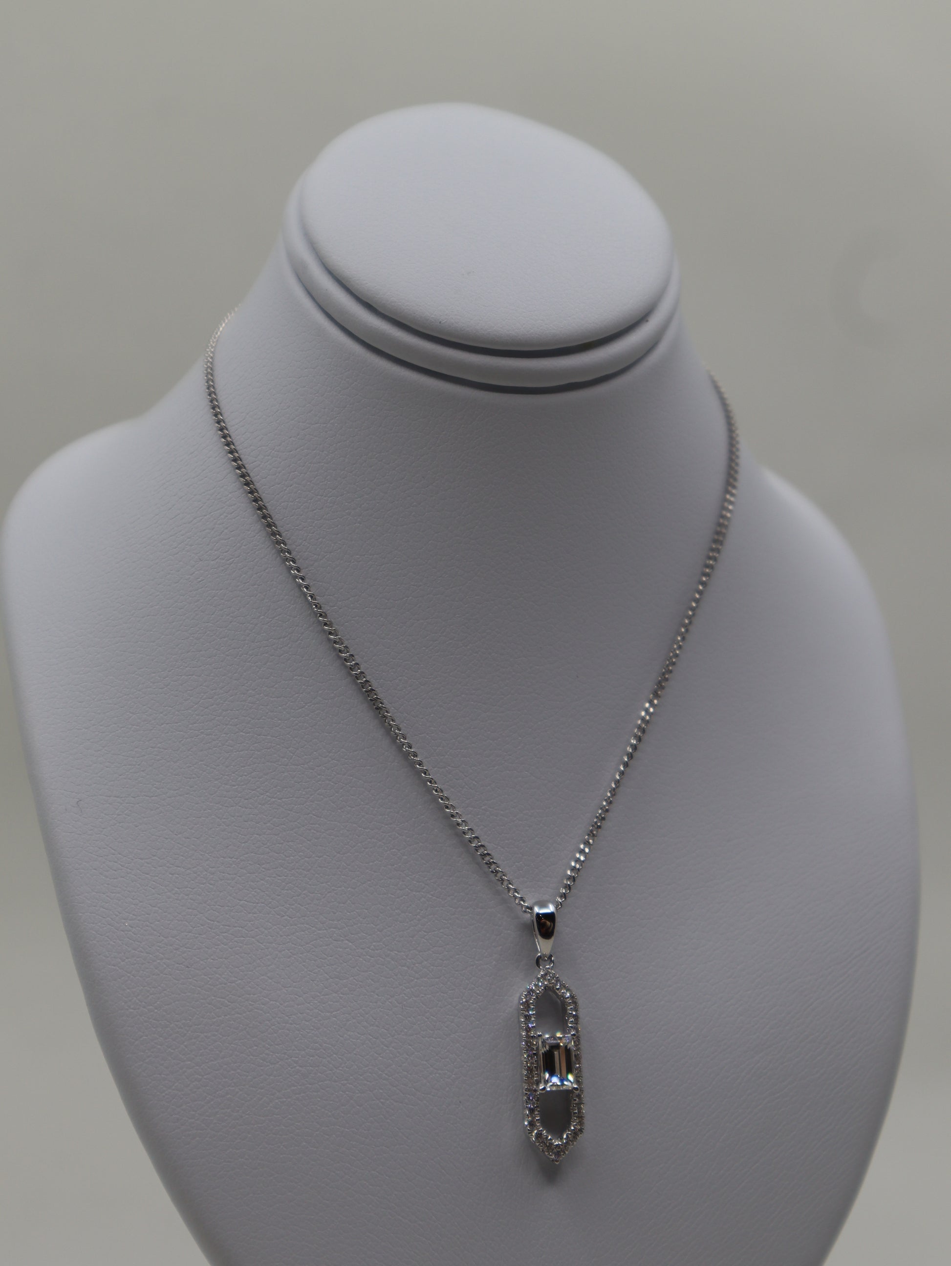 18ct white gold set diamond pendant and chain. A single emerald cut diamond in a 4 claw setting held in an open elongated hexagonal shape set with a single row of brilliant cut diamonds. A plain bale above and hangs on an 18 inch 45cm curb link chain. Total diamond weight 0.57ct G colour Vs clarity.