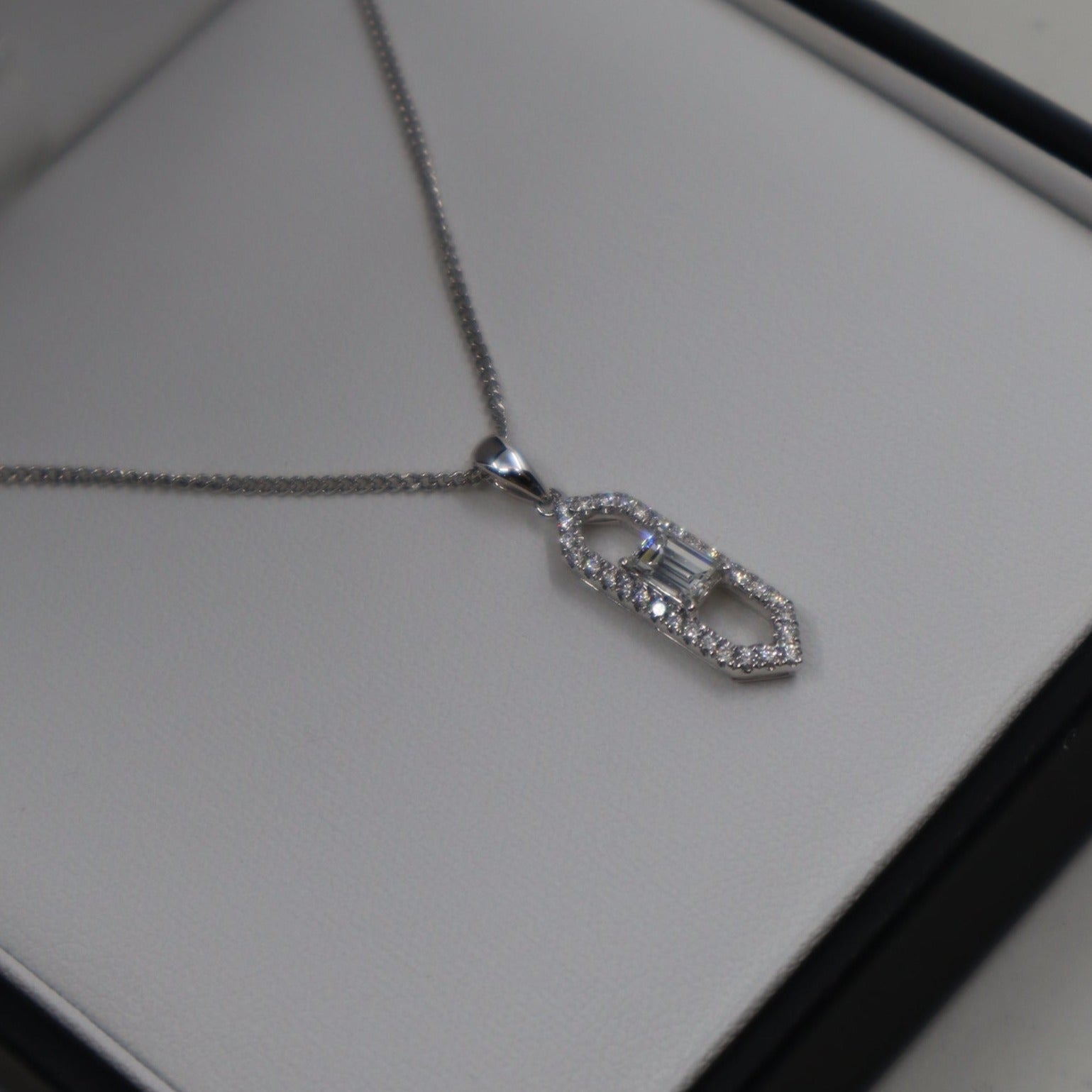 18ct White Gold Emerald Cut Diamond Pendant and Chain