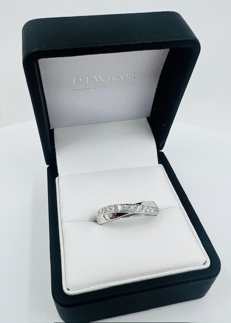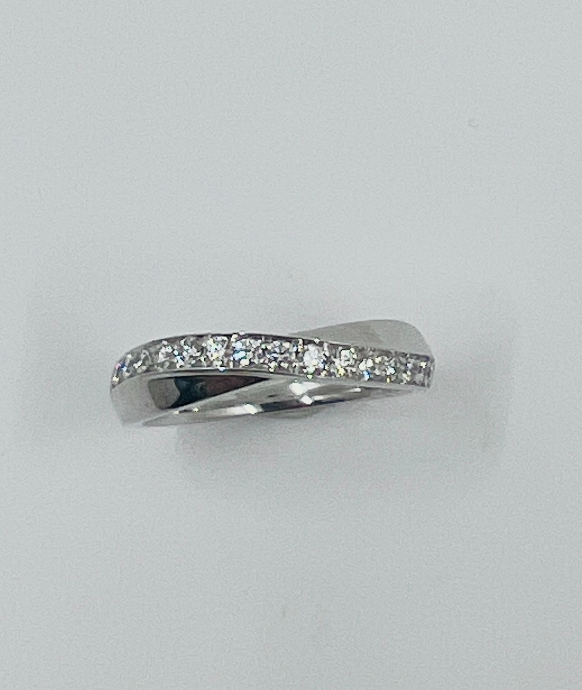 A platinum cross-over diamond eternity ring. A single row of 15 brilliant cut diamonds in claw settings in a cross over design.