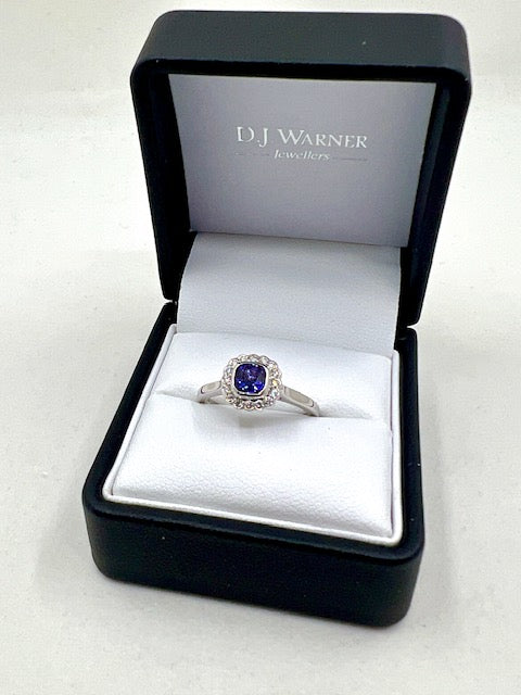 A platinum set sapphire and diamond cluster ring. A single cushion cut purple sapphire in a bezel setting surrounded by a halo of sixteen round brilliant cut diamonds in rub over bezel settings. The head is Wed-Fit and fitted to a plain shank.