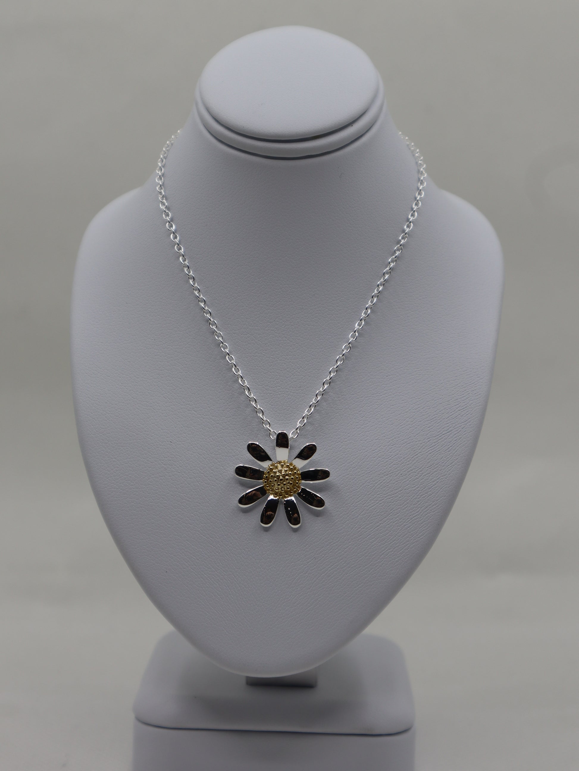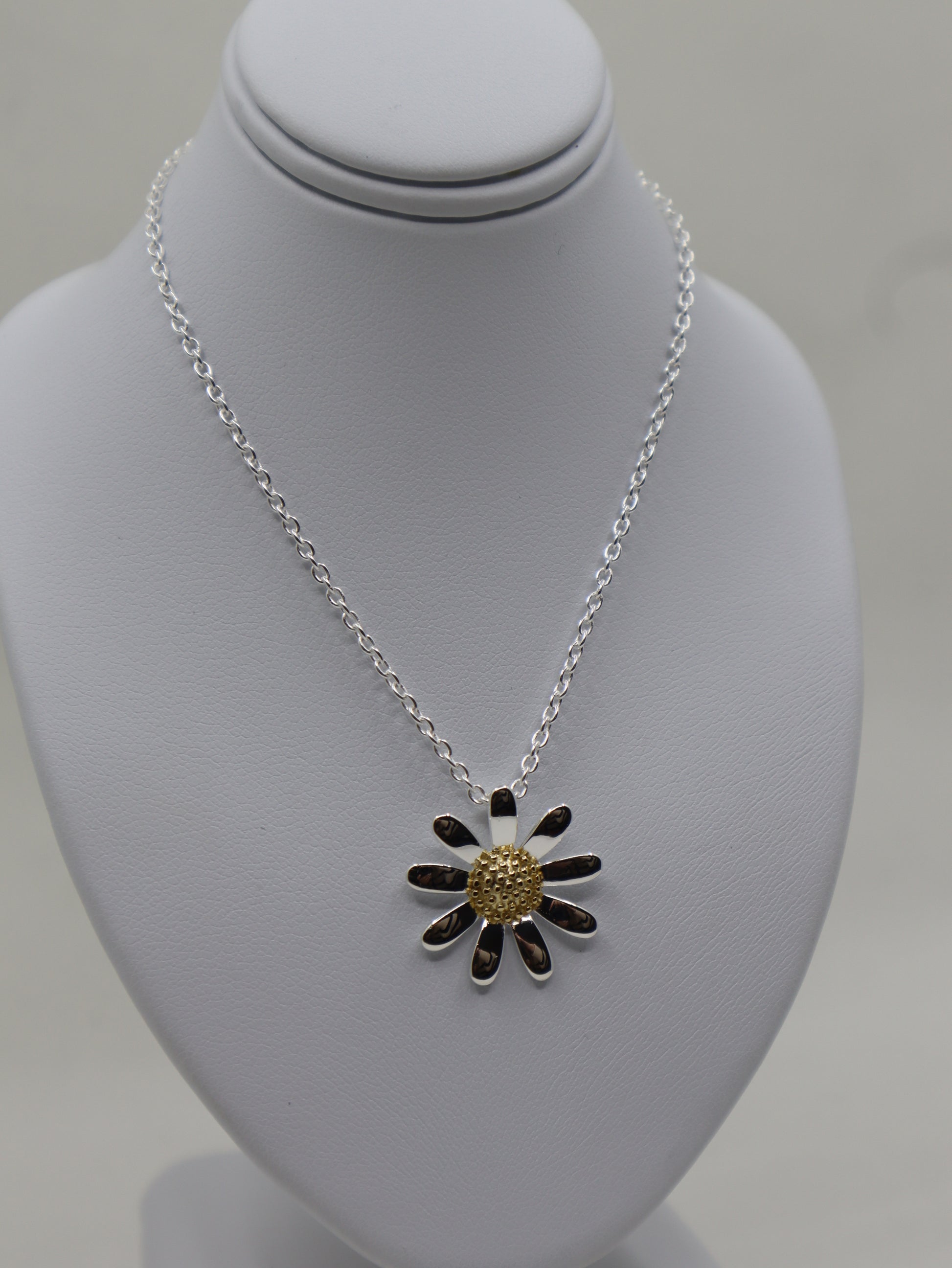 Sterling silver and gold plate daisy pendant on a 16 inch/40cm trace link chain. Daisy