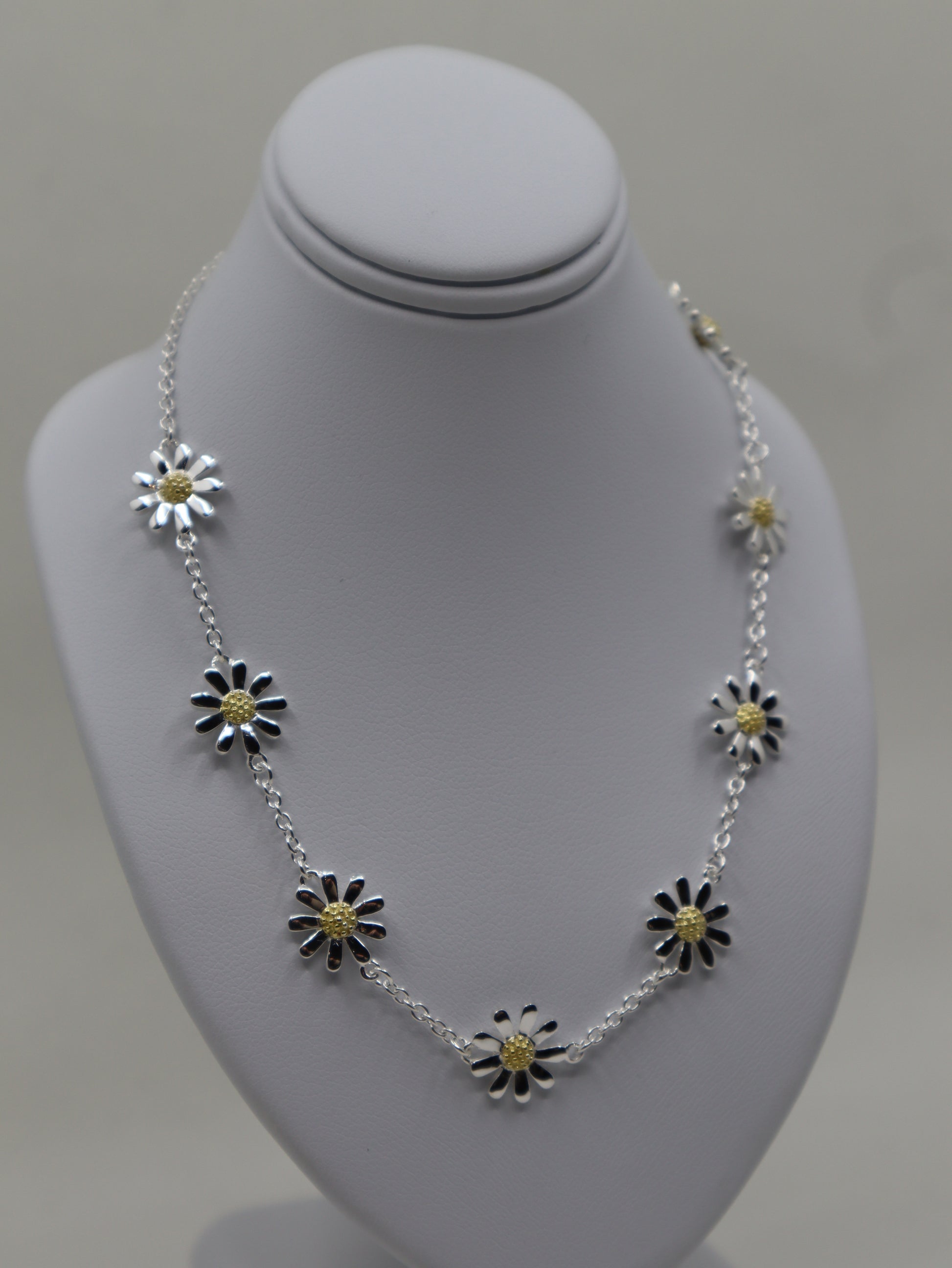 Sterling silver and gold plate daisy set necklet. 8 double sided 10mm daisies separated by 15mm of trace chain. Total length 16 inch/40cm with a 3cm extension.