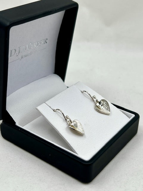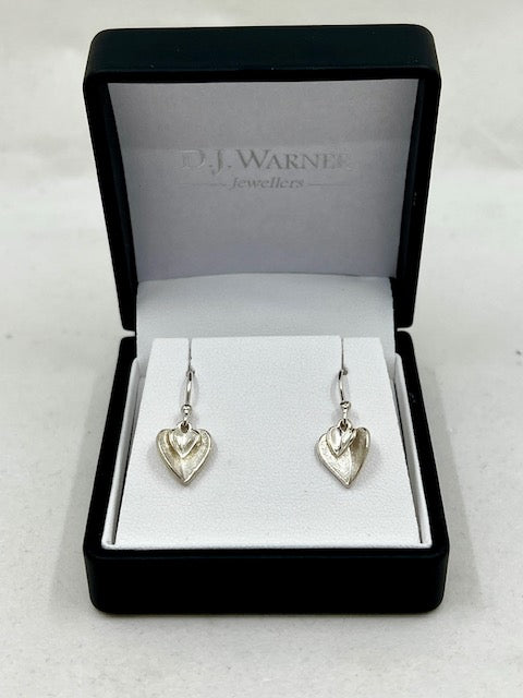 Silver double heart earrings on hook wire fittings. A larger wire brushed finish larger heart with a smaller plain heart hanging in front.